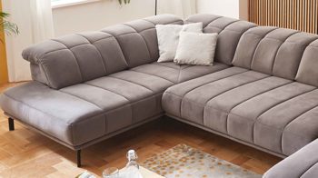grauer Stoffbezug in Samtoptik und mattschwarze Metall-Winkelfüße