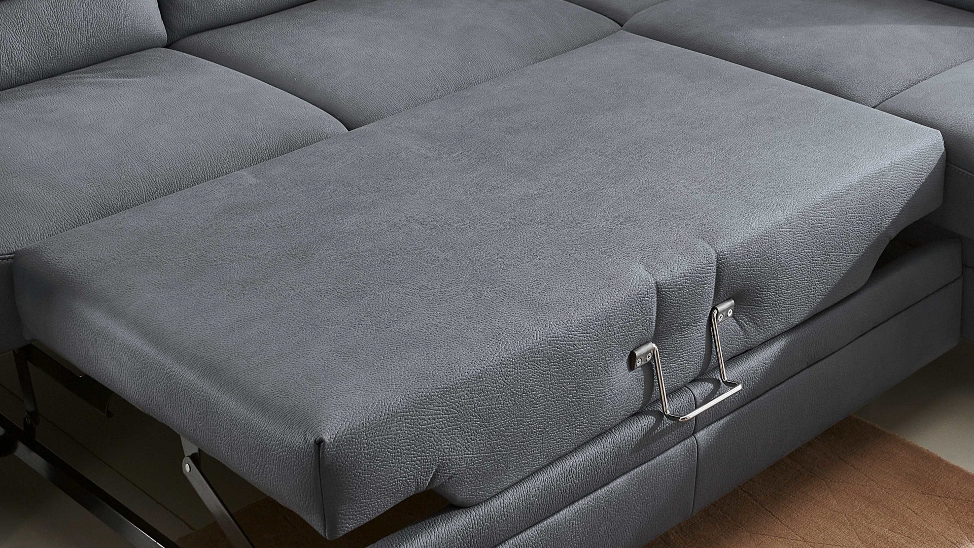 Bei der stoffbezogenen Liegefläche handelt es sich um einen stilvollen Mehrpreis für die Möbel mit Bettfunktion aus dem Modulmaster-Polsterprogramm MM-PP1133. Durch dieses Extra präsentiert sich die Liegefläche im Originalstoff des jeweiligen Sofas. Der graue Mikrofaserbezug mit genarbter Oberfläche strahlt moderne Eleganz aus.