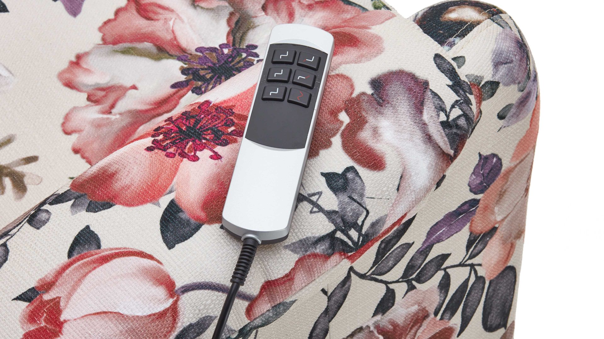 Dank der legeren Federkernpolsterung auf hochwertiger Wellenunterfederung im Sitz sowie der Schaumpolsterung im Rücken sitzen Sie auf dem floralen Ohrenbackensessel der Ergonomiegröße M sehr bequem. Dazu tragen auch die verschiedenen Funktionen bei. Der TV-Sessel bietet die manuelle Kopfpolsterverstellung mit Rastbeschlag und Rückholfeder. Hinzu kommt die einmotorig-elektrische synchrone Verstellung der Rückenlehne und des Fußteils von der Sitz- zur TV- bis zur Liegeposition. Im komplett ausgefahrenen Zustand beträgt die Liegelänge ca. 176 cm. Mit der praktischen Fernbedienung lässt sich der Komfortsessel einfach steuern. Zur Aufbewahrung dieses nützlichen Zubehörs und auch von Zeitschriften verfügt das Möbel über eine Seitentasche. Funktionsstark abgerundet wird der Sessel durch die Aufstehhilfe.