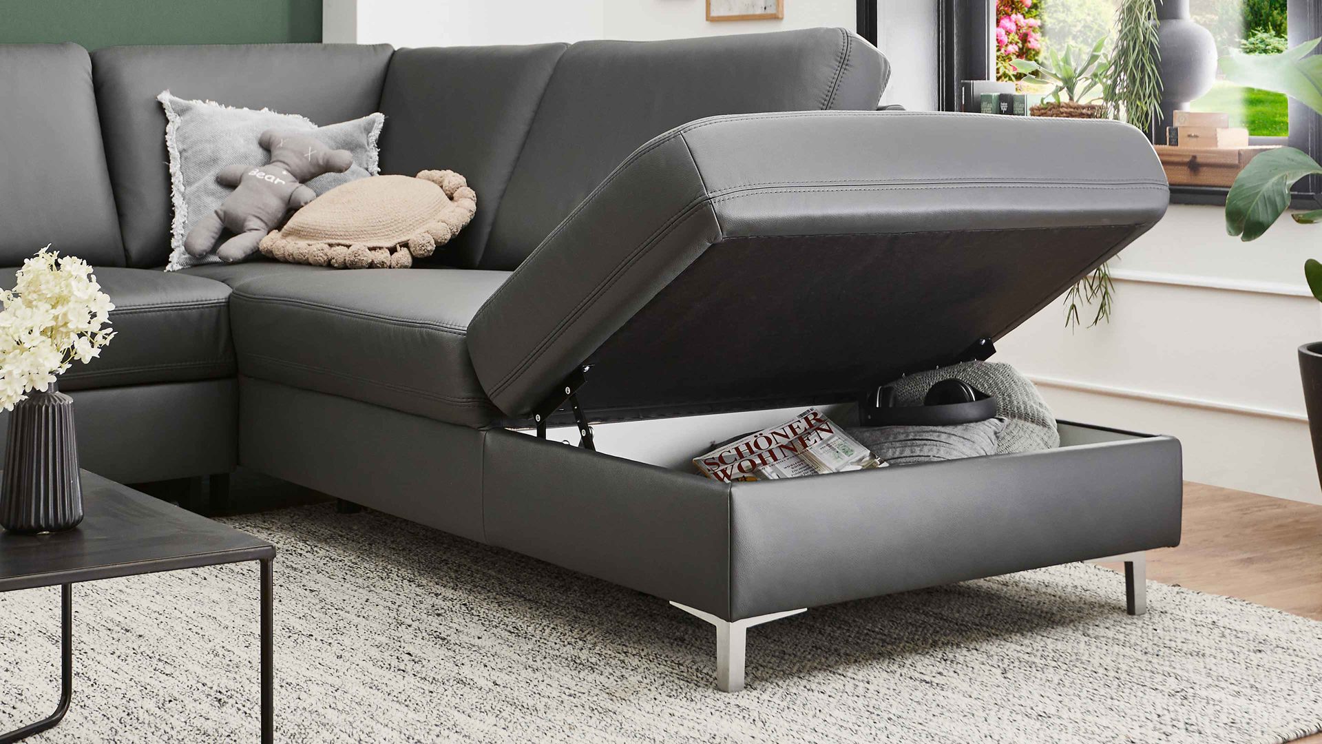 Das Sofaelement lässt sich mittels Rasterbeschlag bequem öffnen und schließen. Den innen weiß beschichteten und mit eingelassenen Lüftungsschlitzen versehenen Stauraum können Sie etwa zum Verstauen von Wohntextilien und Spielzeug nutzen.