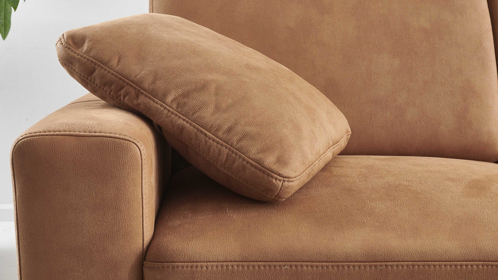 Dabei wirkt der Materialmix aus einem zimtfarbenem Mikrofaserbezug und den mattschwarzen Metallfüßen sehr edel. Das Ecksofa benötigt eine Stellfläche von ca. 276 x 163 cm (BxL, von links nach rechts). Zu Ihrer neuen stilvollen Wohnlandschaft gehören ein 2,5-Sitzer mit Armlehen links und ein Canape mit Armlehne rechts.