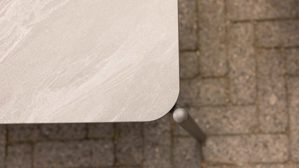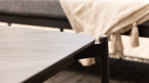 Der Lounge-Couchtisch ergänzt das Set perfekt. Mit seiner eleganten Tischplatte aus grauem gesintertem Stein wirkt er hochwertig und modern. Sintered Stone ist besonders kratzfest, stoßfest, UV-beständig, farbecht und wetterfest – ideal für intensiv genutzte Outdoor-Bereiche. Das pulverbeschichtete Aluminiumgestell in Matt-Anthrazit macht den Tisch stabil und gleichzeitig angenehm leicht. Die großzügige Tischfläche und die sanft abgerundeten Ecken sorgen für ein harmonisches Gesamtbild und eine sichere, komfortable Nutzung.