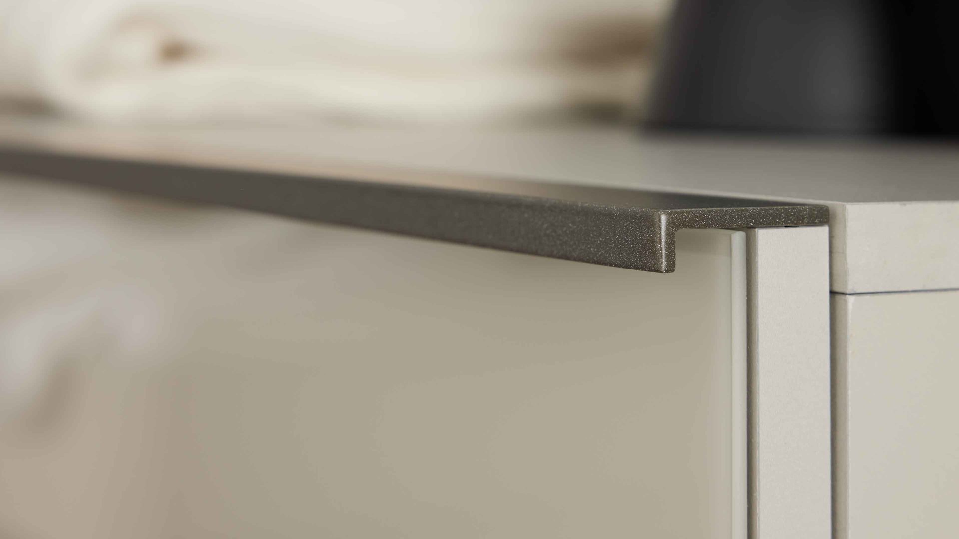 Die Möbel kombinieren weiße und kieselgraue Glasfronten mit pflegeleichten Oberflächen in abgestimmten Farbtönen. Das Polsterkopfteil in havannafarbenem Kunstleder setzt einen warmen Akzent, während schieferfarbene Metall-Details dem Ensemble eine moderne, edle Note verleihen. Das silbergrau gestreifte Innendekor unterstreicht den hochwertigen Charakter und sorgt für ein stimmiges Gesamtbild.