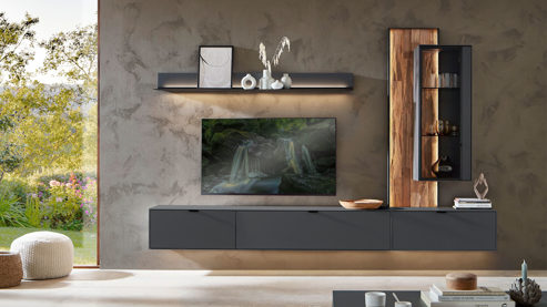 Das Möbelspektrum reicht von einem Low-, einem Side- und einem Highboard über eine Vitrine und ein Wandregal bis hin zu einem Couch- und einem Funktionsesstisch. Sämtliche Elemente kommen im gleichen Design daher, sodass Sie Ihr Wohnzimmer einheitlich einrichten können.