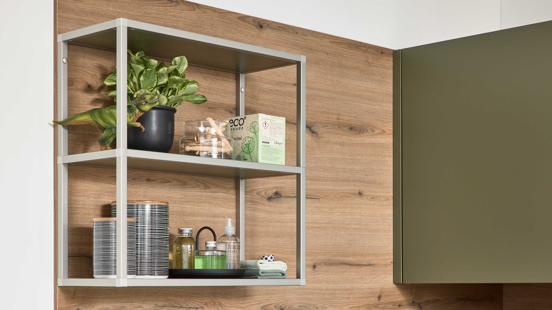 Die Interliving Küche Serie 3074 zeigt, dass auch ein Hauswirtschaftsraum mehr sein kann als nur Stauraum. Mit ihren softmatten olivgrünen Fronten strahlt sie Wärme und Natürlichkeit aus, während die authentische Vulkaneiche-Nachbildung an Sockelblenden, Regalen und Nischenverkleidung für wohnlichen Charakter sorgt. Dezente Metallgriffe runden das harmonische Gesamtbild im beliebten Natural-Living-Stil stilvoll ab.