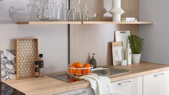 Die Nischenverkleidung Oak Line in hell eichfarbener Optik sowie Steckboarde und Arbeitsplatte in Eiche Montreal-Nachbildung setzen einen warmen, natürlichen Kontrast. So entsteht ein harmonisches Zusammenspiel aus moderner Hochglanz-Ästhetik und wohnlicher Holzoptik.