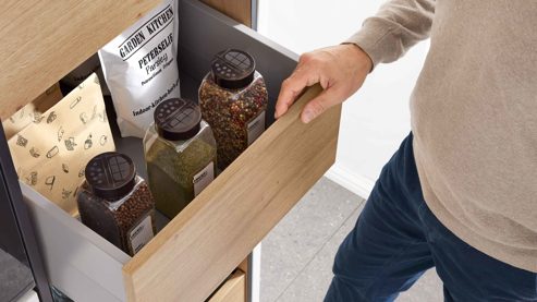 Darüber hinaus ist der hochgebaute Constructa Einbaubackofen CF3M10053 mit fünf Heizarten und Energieeffizienzklasse A (Spektrum A+++ bis D) integriert, wodurch Sie besonders komfortabel und ergonomisch arbeiten können. Ein offenes, holzfarbenes Schubladenregal lockert das Design zusätzlich auf und bietet praktischen Stauraum für häufig genutzte Küchenutensilien.