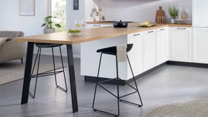 Die WERT KÜCHE® Vida verbindet den charmanten Charakter einer Landhausküche mit einer klaren, modernen Gestaltung. Satinweiße Fronten treffen auf warme Elemente in naturfarbener Asteiche-Nachbildung, während lavaschwarze Sockelblenden und Schwarzstahl-Bügelgriffe stilvolle Kontraste setzen. So entsteht eine Küche, die Gemütlichkeit und zeitgemäßes Design perfekt miteinander vereint.