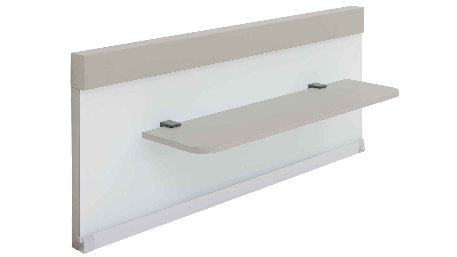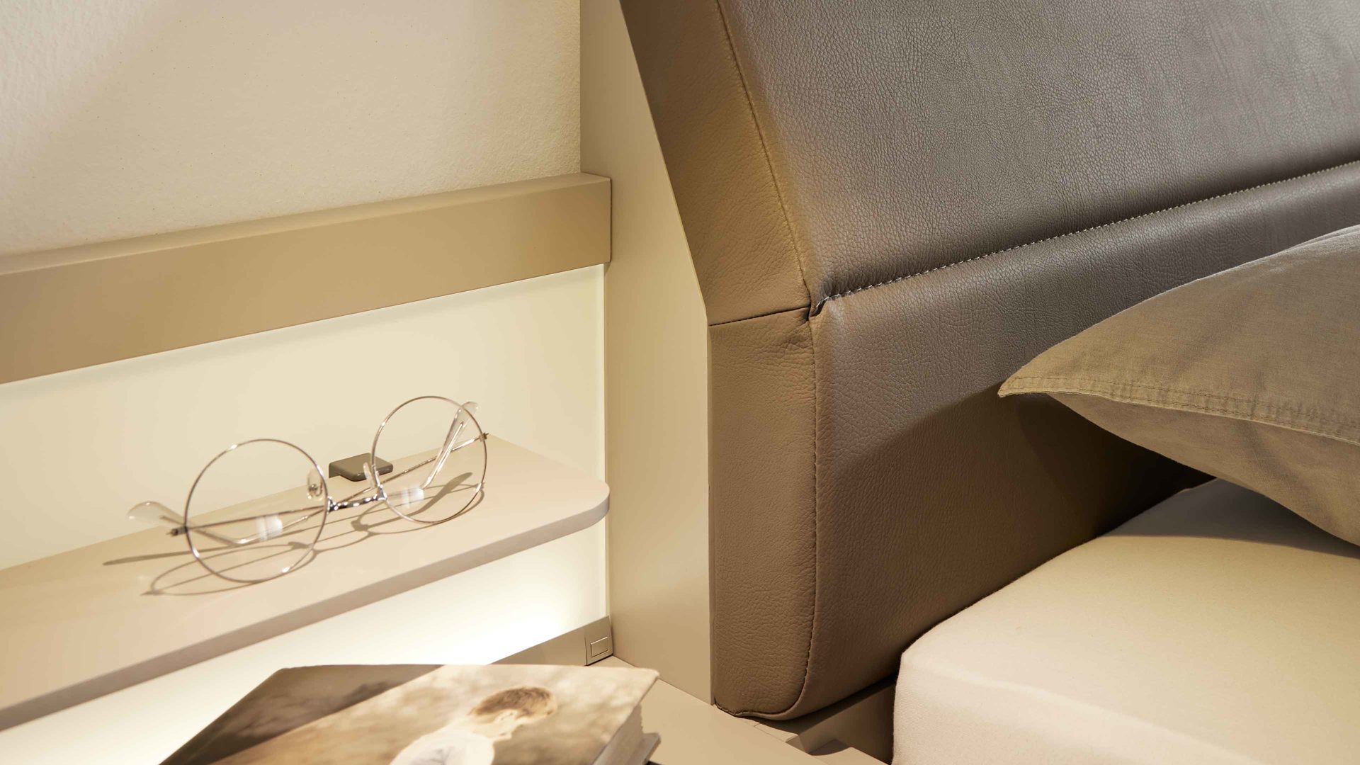 Die Kombination aus kieselgrauen und weißen Kunststoffoberflächen mit weißen Glasauflagen harmoniert perfekt mit der integrierten LED-Beleuchtung. Die fest verbauten LED-Leuchtmittel mit der Energieeffizienzklasse F (Spektrum A bis G) sorgen für ein dezentes, warmes Licht direkt am Bett. Über den praktischen Kippschalter steuerst du die Beleuchtung ganz bequem.