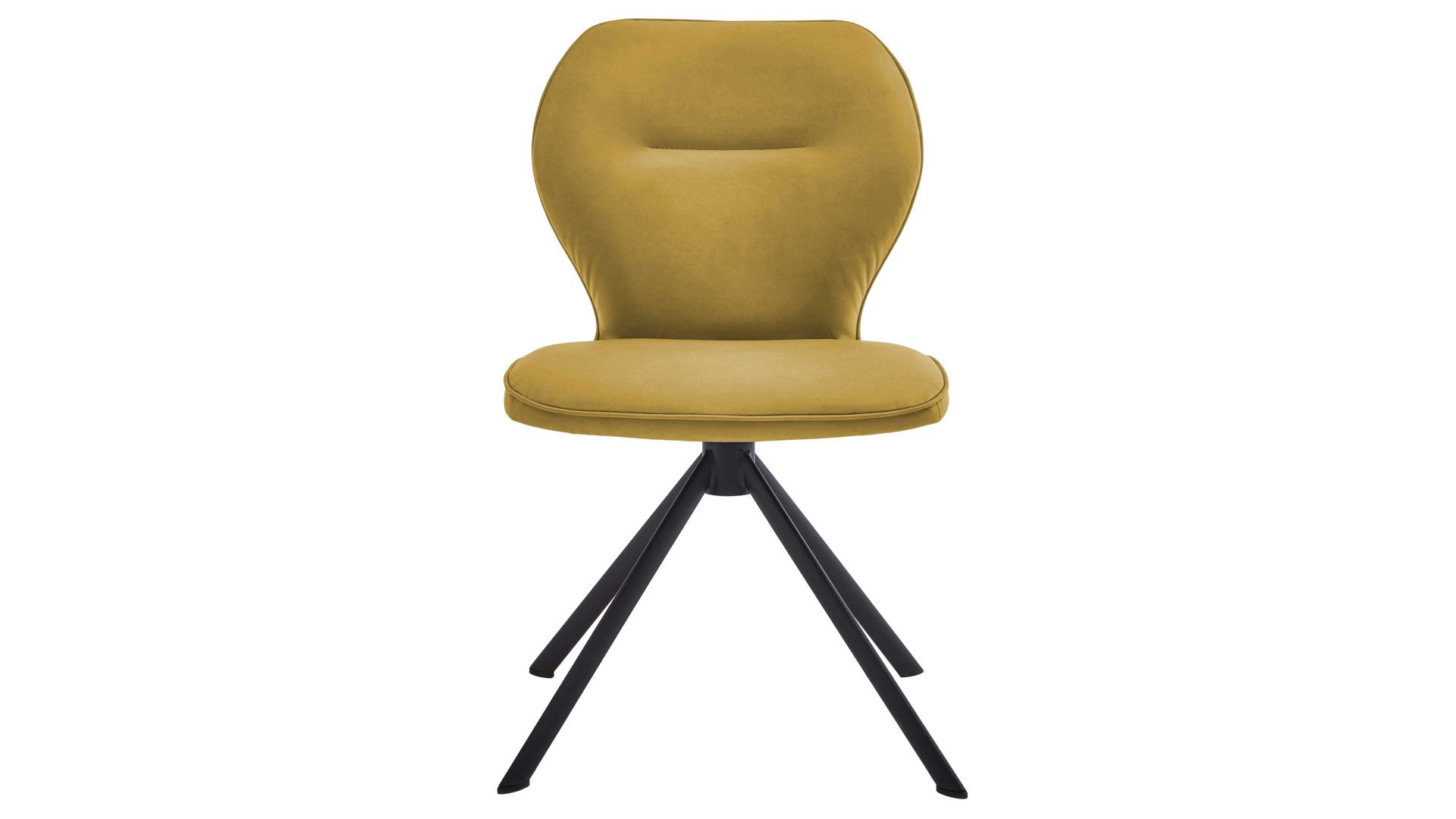 Er kombiniert ein mattschwarz lackiertes Stativgestell aus robustem Eisen mit einem gelben Mikrofaserbezug in Lederoptik und fügt sich in verschiedene Wohnstile harmonisch ein. Zu den optischen Highlights des Esszimmerstuhls gehört neben der Formensprache und den perfekt aufeinander abgestimmten Farben der markante Quereinzug im Rücken.