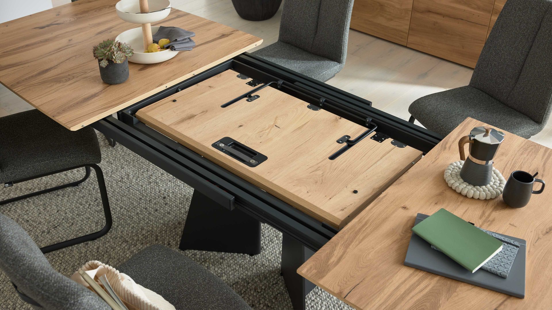 Die Verlängerung funktioniert dank des integrierten Mittelauszugsystems besonders komfortabel. Mit wenigen Handgriffen ziehst du die Tischplatte auseinander und klappst die innenliegende Einlage einfach auf. So vergrößerst du die Tischfläche um ca. 100 cm – schnell, leicht und stabil.