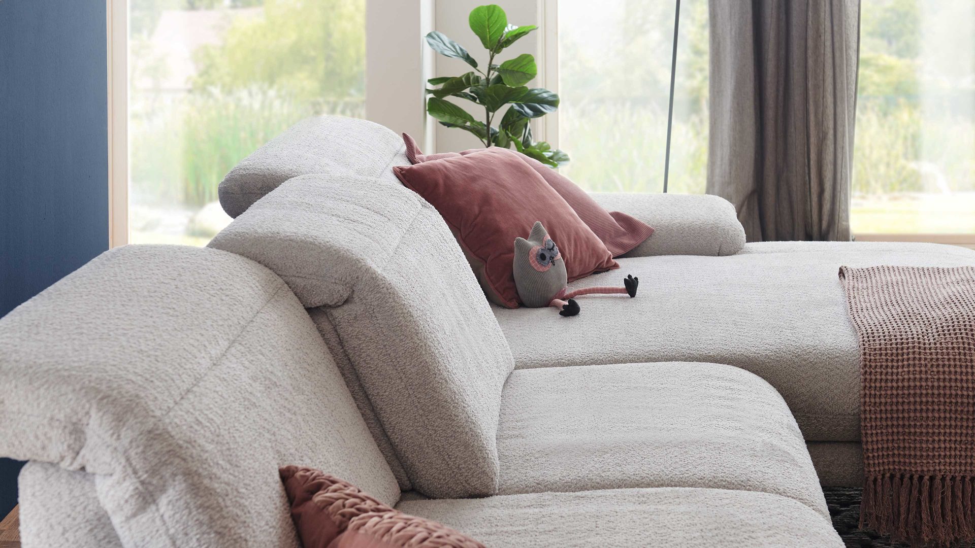 Das in allen Belangen überzeugende Modulmaster Polsterprogramm MM-MP1171 bringt mehrere Besonderheiten mit: Sämtliche Rückseiten sind im Originalstoff bezogen. Zu den Highlights gehören überdies die Bodenfreiheit, die zu einem angenehmen, offenen Ambiente beiträgt und den einwandfreien Einsatz eines Saugroboters ermöglicht und die Kopfteilverstellung bei allen Elementen mit Rückenlehne.