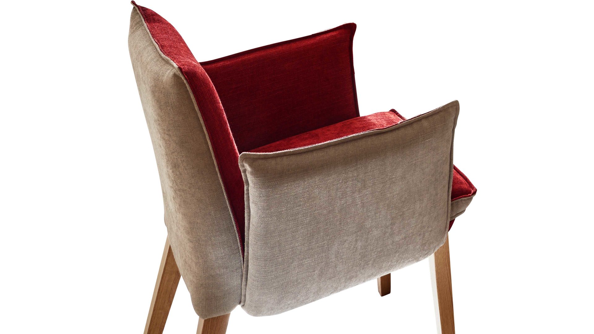 Mit einer auffälligen Farbkombination ist dieser Polsterstuhl mit Armlehnen und vier Eichenholzfüßen der Hingucker. Ob als Esszimmermöbel oder als Sitzmöbel in der Wohnküche. Sitzfläche und Rückenfläche sind mit leuchtendem Rot bezogen, wohingegen die Rückseite camelfarben ist. Die Knopfheftung im Rücken ist ein weiteres hübsches Detail.