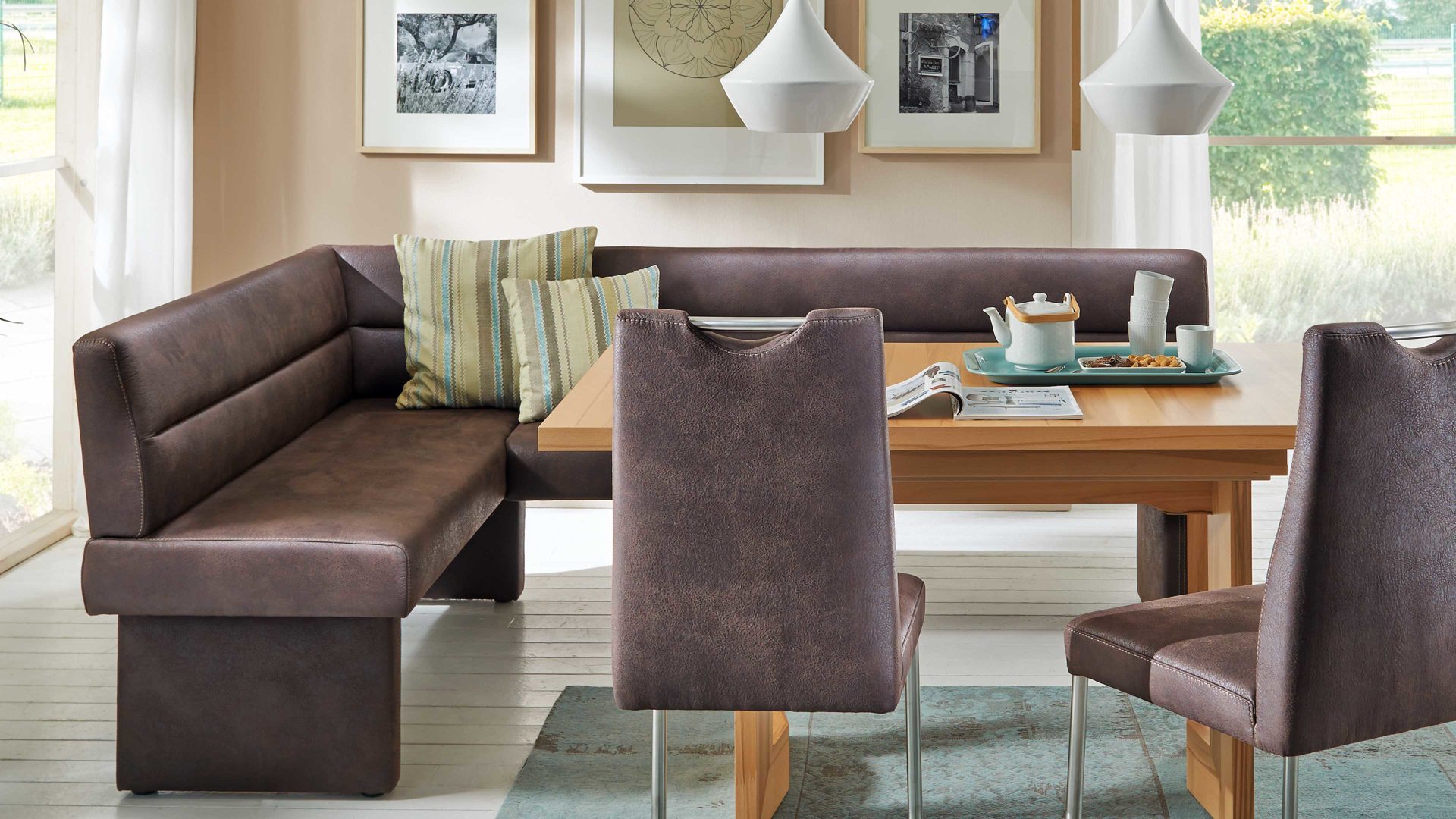 In Ihrer Küche machen Sie es sich auf dieser wunderbaren Modulmaster Eckbank Game 1 bequem. Stilvoll und elegant präsentiert sich die Dinnerbank mit einem dunkelbraunen Microfaserbezug, der sich mit den Kontrastnähten harmonisch in Ihre Kücheneinrichtung einfügt. Versammeln Sie Familie und Freunde um Ihren Küchentisch auf der Küchenbank, die Sie über Eck stellen und so auch ungenutzten Raum optimal ausfüllen.