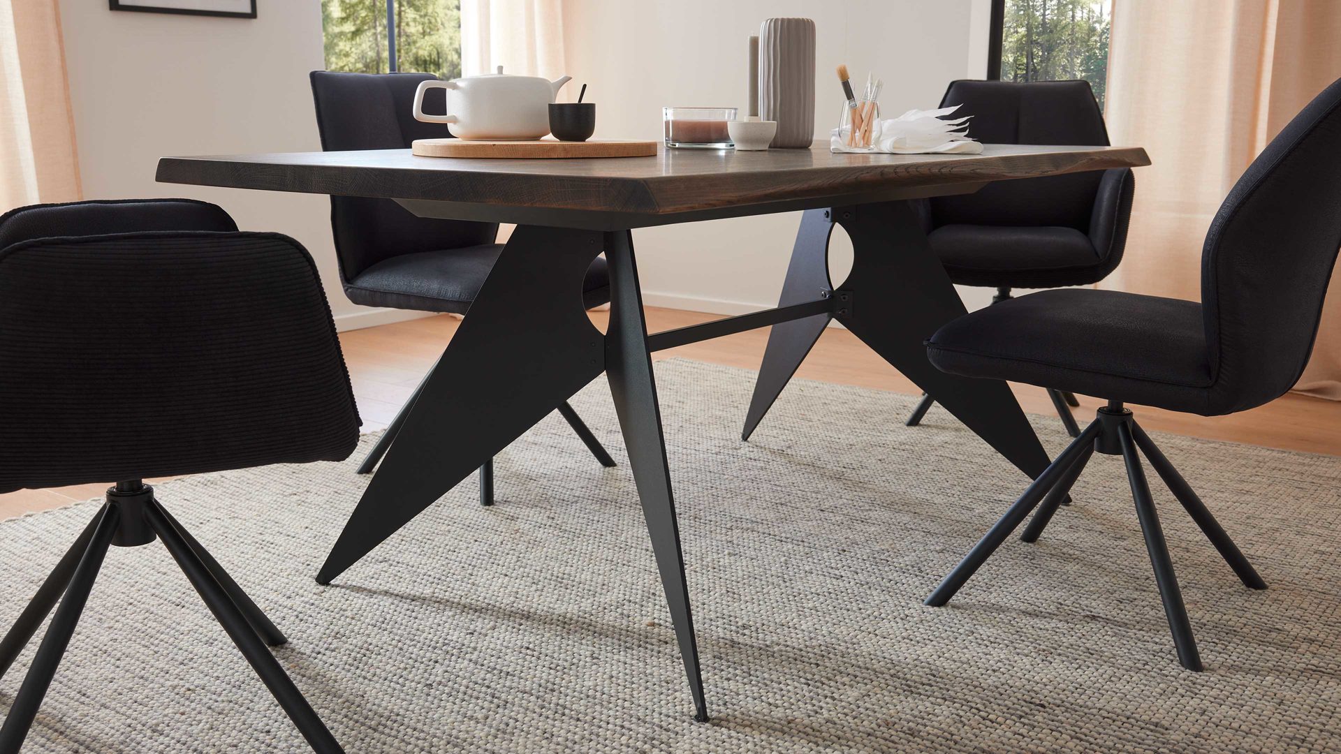 Besonderer Hingucker ist das robuste Gestell aus kreativ geformtem, schwarzem Stahl, das dem Tisch eine architektonisch anmutende Basis verleiht. Die Kombination aus dunkler Eiche und kühlem Metall sorgt für spannende Kontraste und verleiht deinem Wohnbereich einen urbanen Charakter.