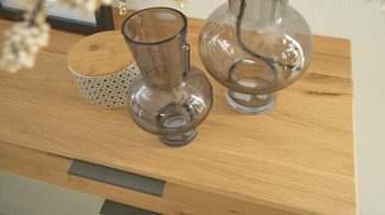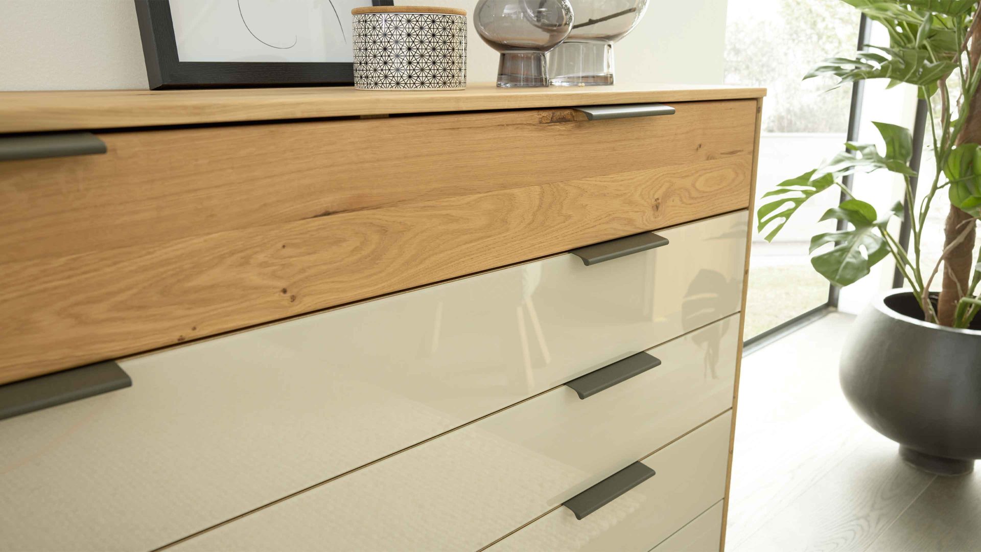 Die edle Frontgestaltung besteht aus champagnerfarbenem Glas, kombiniert mit einem Korpus in biancofarbener Eiche-Nachbildung. Besonderer Hingucker: die oberste Schubladenfront aus massiver biancofarbener Eiche, die dem Möbelstück eine natürliche, handwerkliche Note verleiht. Schieferfarbene Metallgriffe und eine Innenausstattung in Erle-Nachbildung runden das Gesamtbild harmonisch ab.