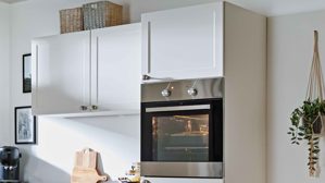 matte magnolienfarbene Lacklaminatfronten, kombiniert mit Eiche Klassik-Nachbildung
