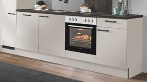 Küchenzeile mit starekn Akzentfronten, hochwertiger Edelstahl-Einbauspüle und Nischenverkleidung, Länge ca. 290 cm