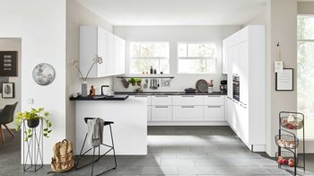 Interliving Küche Serie 3045 – moderne U-Küche in Weiß mit schwarzem Akzent