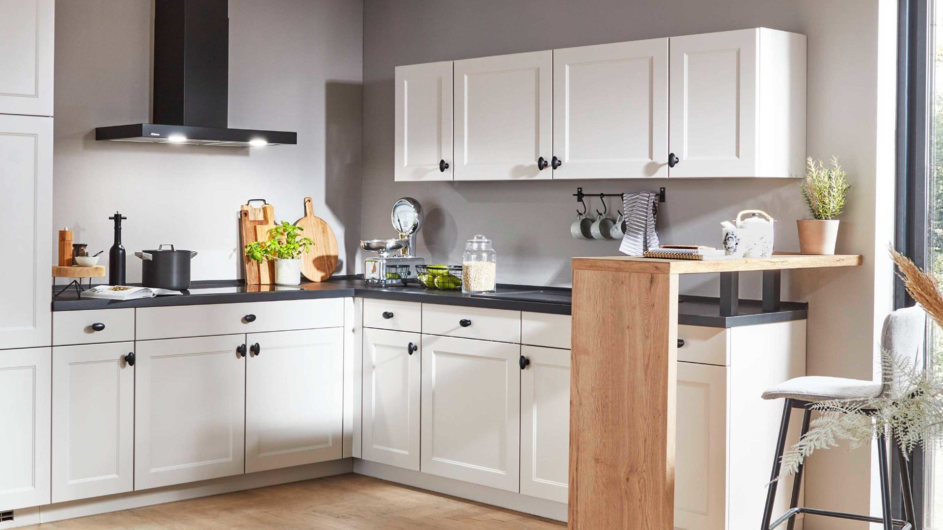 moderne Landhausküche mit praktischer Frühstückstheke