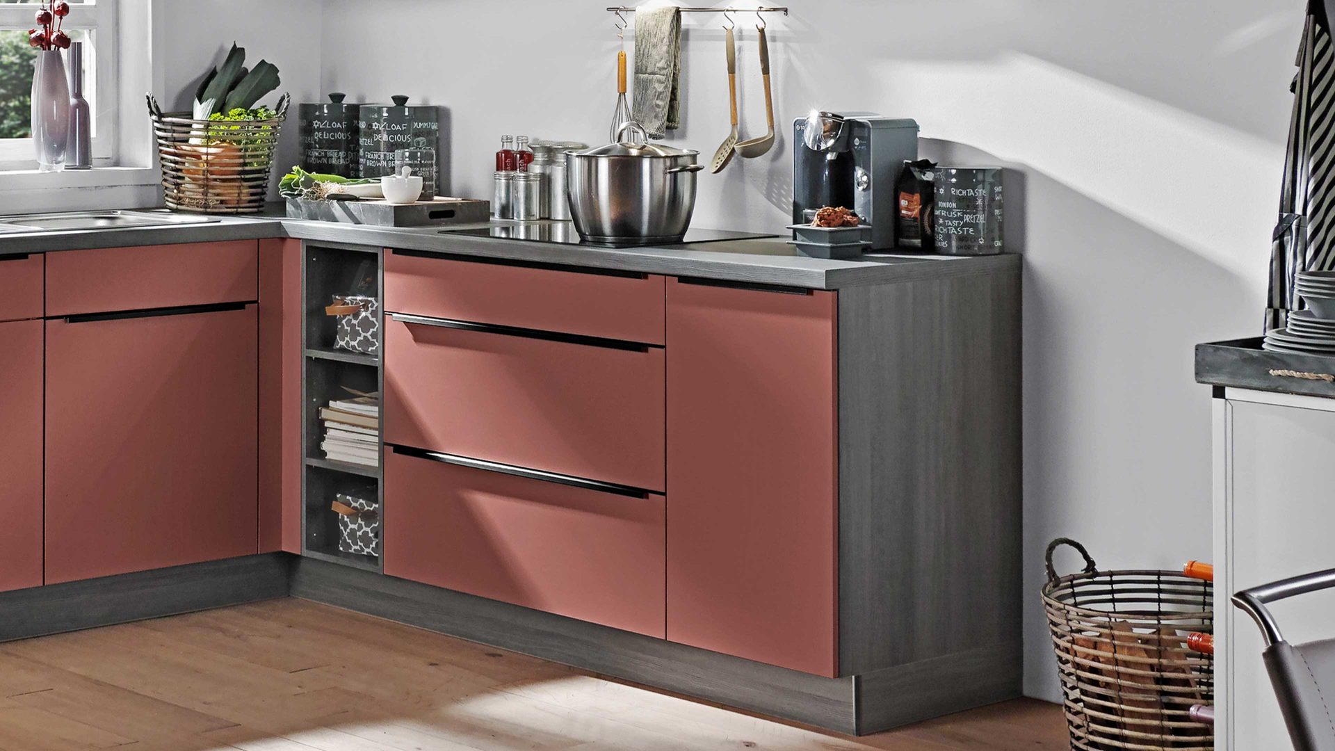 mattes Kaminrot, kombiniert mit grauer Eiche-Nachbildung