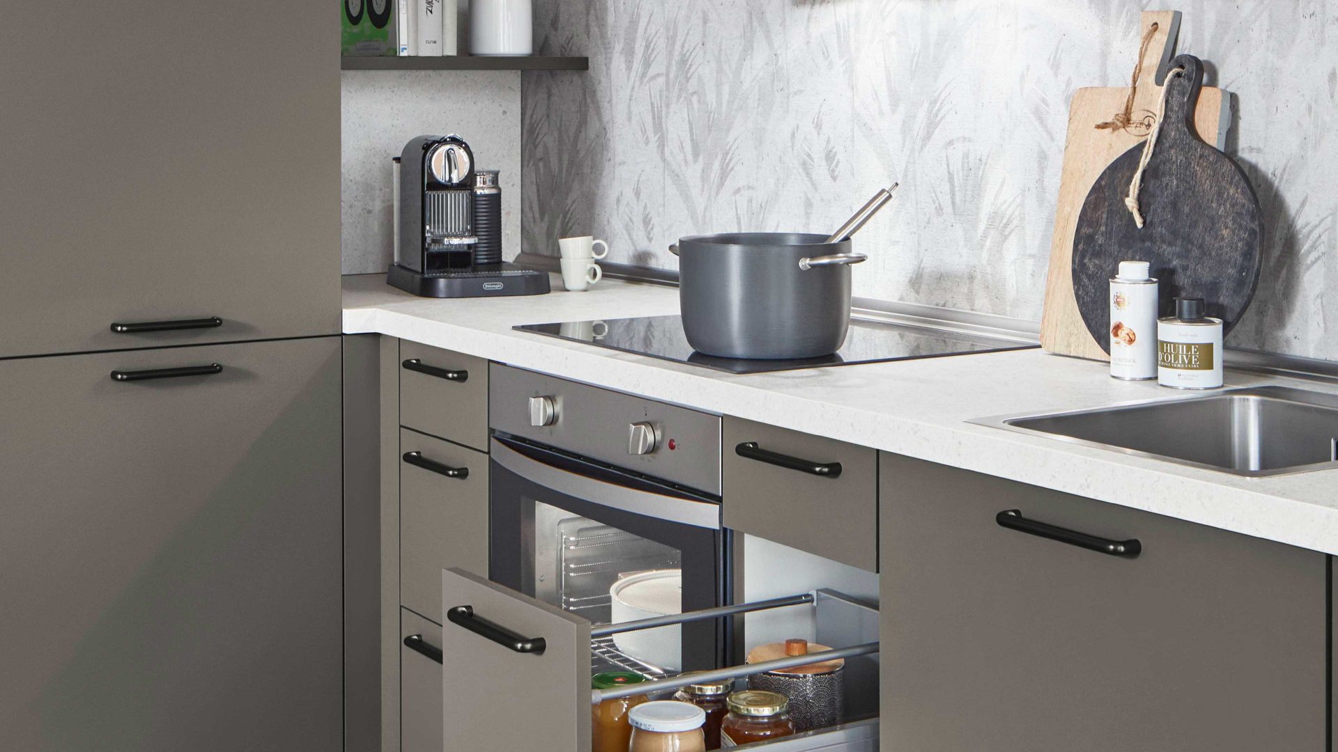 Die nobilia® Einbauküche Laser präsentiert sich in mattem Taupegrau und überzeugt mit einer ruhigen, eleganten Ausstrahlung. Gebürstete anthrazitfarbene Metallgriffe setzen dezente, moderne Akzente. Die Arbeitsplatten in weißer Terrazzo-Nachbildung bringen Frische ins Design und sorgen für einen spannenden, hochwertigen Kontrast.