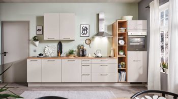 Küchenzeile mit hochwertiger Edelstahl-Einbauspüle und kopffreier Dunsthaube, Länge ca. 270 cm