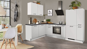 supermattes Magnolienweiß, kombiniert mit schwarzchromfarbenen Metallgriffen und Arbeitsplatten Eiche Aviva-Nachbildung