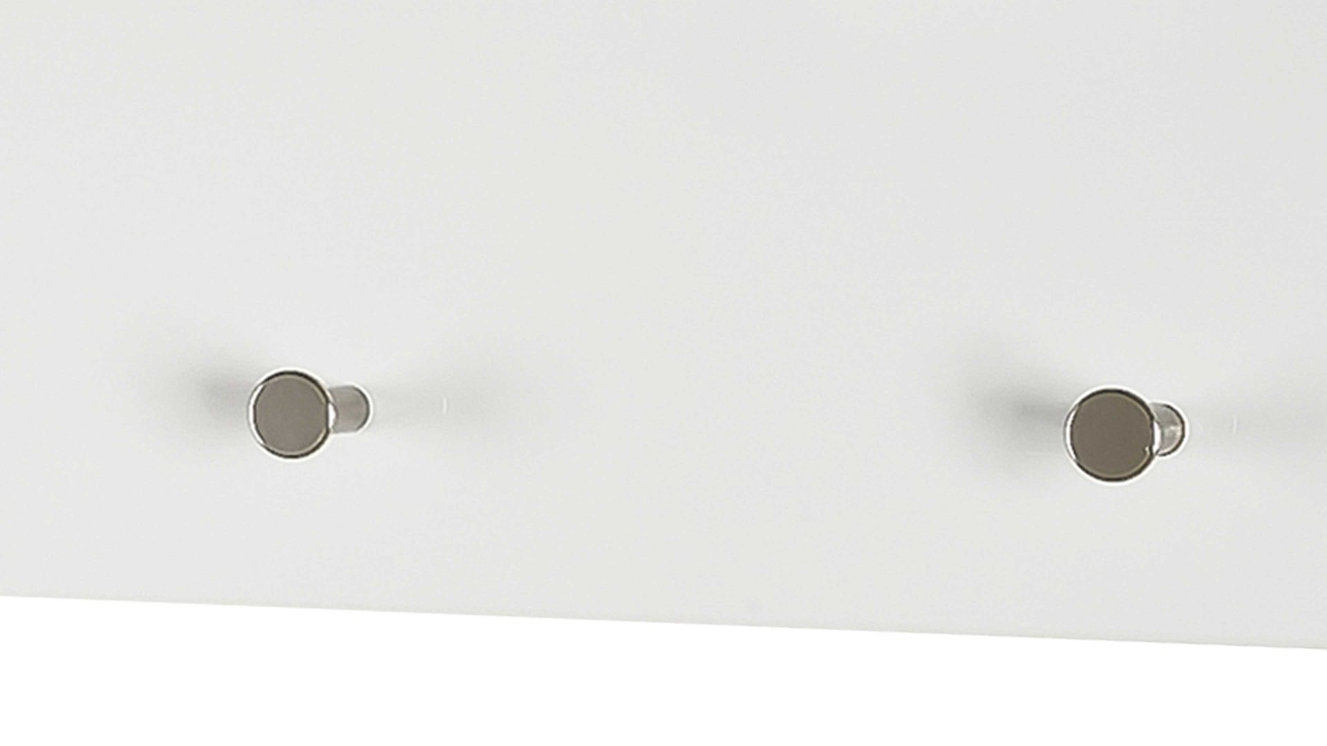 Die Ablagefläche der Garderobenleiste erleichtert Ihnen die ordentliche und griffbereite Aufbewahrung von Mützen, Schals sowie Handschuhen. In Kombination mit einem weißen Sideboard oder einem edelstahlfarbenen Schuhregal kommt diese Wandgarderobe mit Maßen von ca. 75 x 30 x 26 cm (BxHxT) besonders eindrucksvoll zur Geltung. Die mattweißen Oberflächen des Dielenmöbels sind nicht nur widerstandsfähig, sondern auch pflegeleicht.