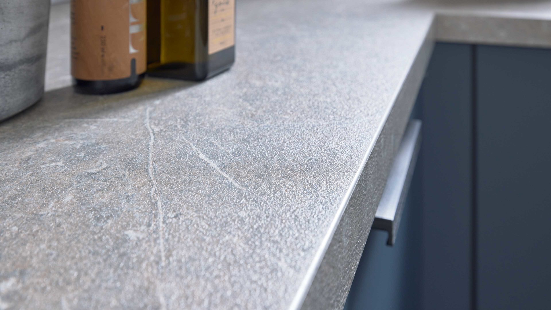Die Culineo® Einbauküche C945 verbindet modernes Design mit durchdachter Funktionalität und einer Farbgestaltung, die Ruhe und Eleganz ausstrahlt. Ultramatte fjordblaue Lacklaminatfronten mit schwarzen Metallgriffen treffen auf schiefergraue Korpusseiten und Sockelblenden, wodurch ein harmonischer Kontrast entsteht. Die hellen Arbeitsplatten in Stromboli-Nachbildung bringen Leichtigkeit in das Gesamtbild und setzen einen natürlichen, freundlichen Akzent.