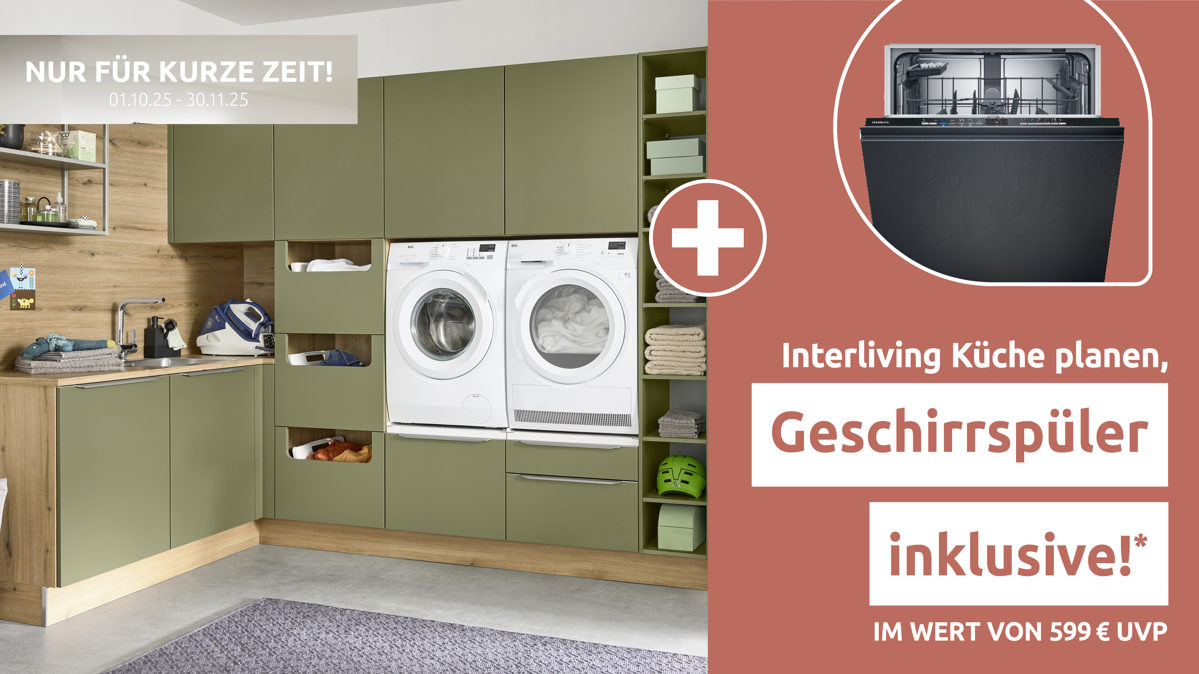* Bei Planung einer Interliving Küche Serie 3074 erhältst du einen Siemens Geschirrspüler SN6IX14TE im Wert von 599 € UVP inklusive. UVP des Herstellers: 599 €, Stand: 10/2025. Gilt nur für Neuverträge frei geplanter Küchen im Aktionszeitraum 01.10.25 - 30.11.25. Es gelten die AGB des jeweiligen teilnehmenden Hauses.