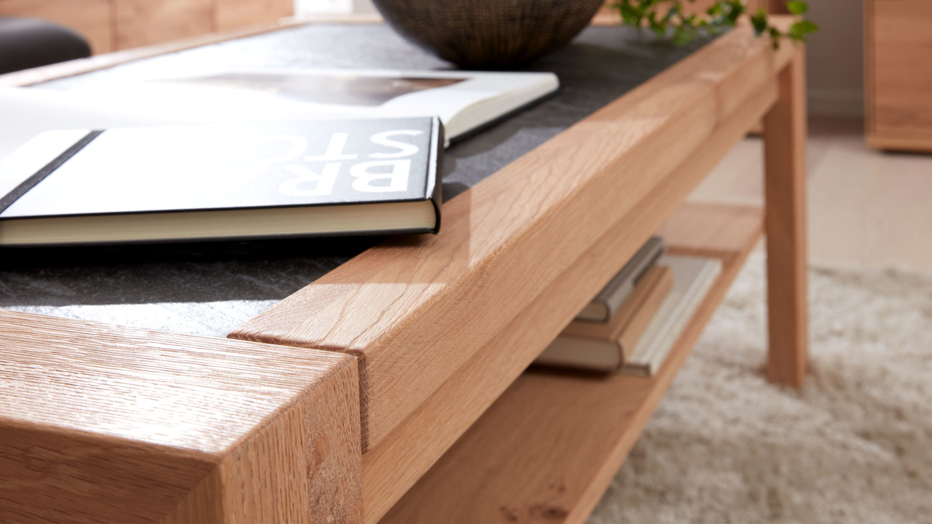 Der Couchtisch ist aus biancofarben geölter und gebürsteter Wildeiche hergestellt. Stilvoll akzentuiert wird der Korpus des Wohnzimmertisches durch die edle Schiefer-Tischplatte - sie setzt sich in einer dunkleren Nuance ab, harmoniert zugleich allerdings perfekt mit dem hellen Ton der Wildeiche. Kombiniert sorgen die beiden natürlichen Farben für eine warme, freundliche und einladende Atmosphäre im Raum.