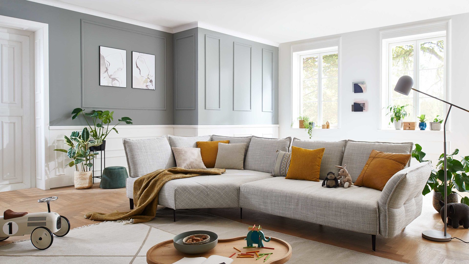 Zierkissen sowie weitere dargestellte Einrichtungsgegenstände sind separat gegen Mehrpreis bestellbar.