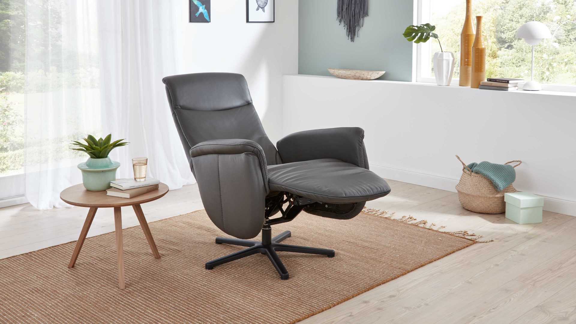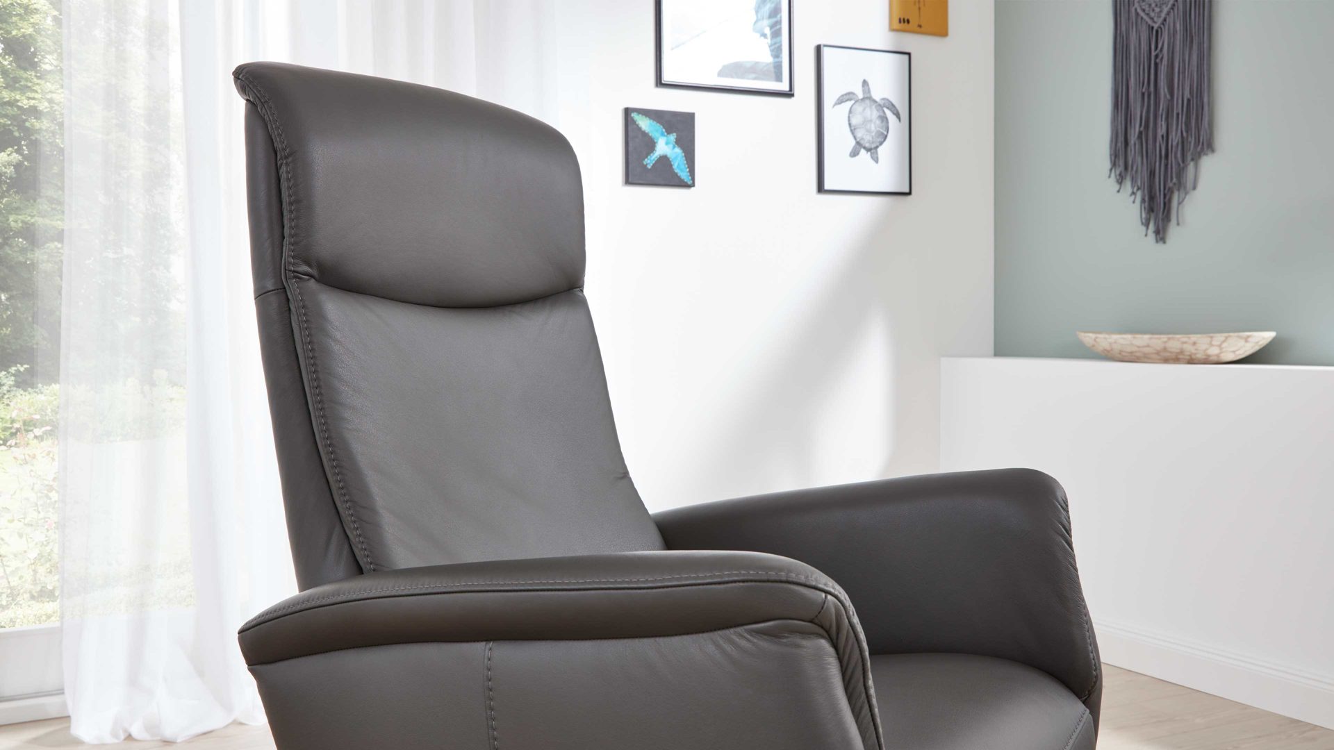 Der Modulmaster Relaxsessel MM-PN1062 ist exzellent verarbeitet und besonders stilvoll designt. Mit dem anthrazitfarben pigmentierten Glattlederbezug samt Ton-in-Ton-Kappnaht strahlt er moderne Eleganz aus. Für hohe Standfestigkeit sorgt der mattschwarze Aluminium-Sternfuß V1S, der die Optik zudem harmonisch abrundet.