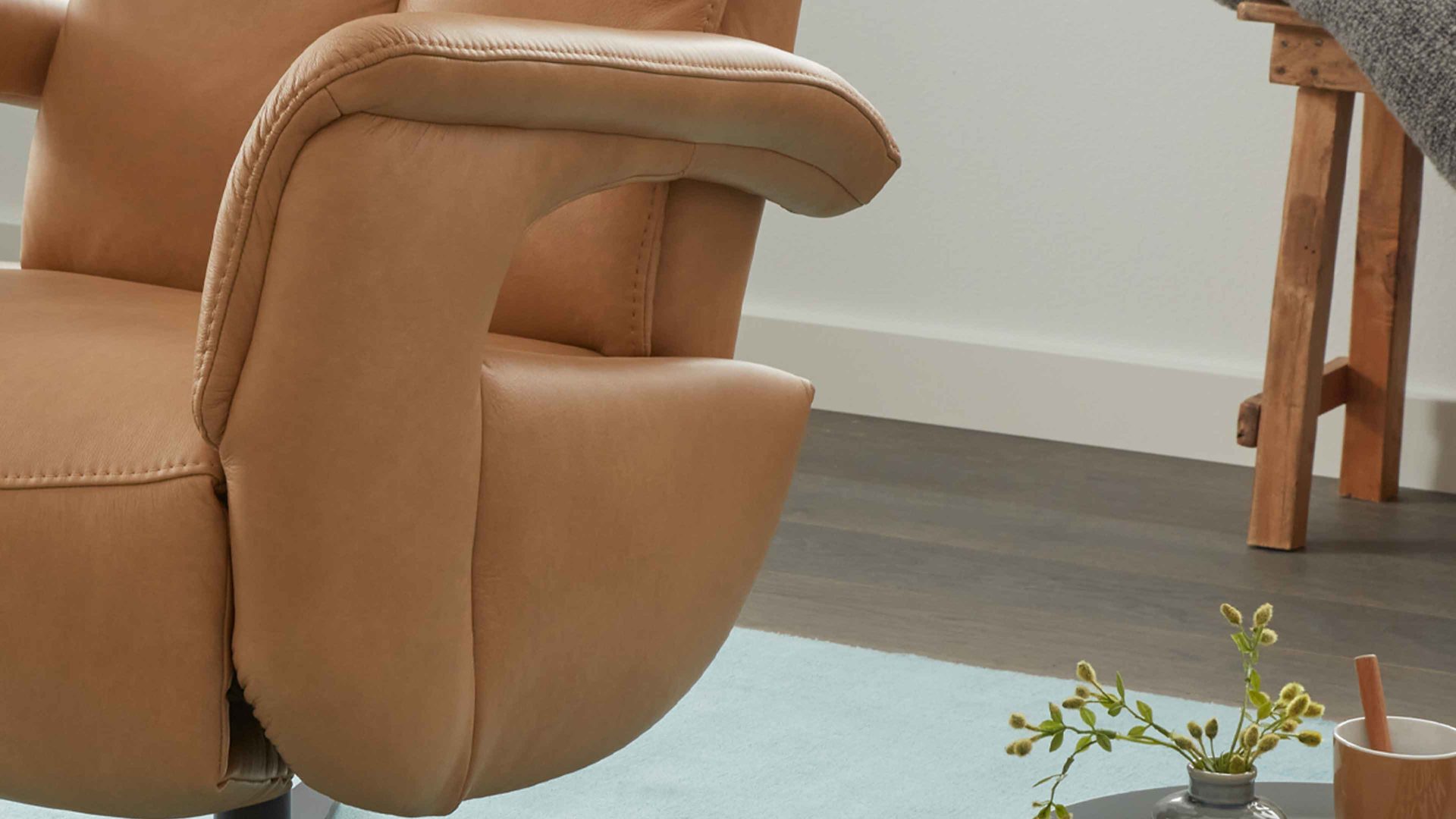 Dank der hochwertigen Polyätherschaumpolsterung auf einer Wellenunterfederung, der ergonomischen Rückenlehne B, den Polster-Armlehnen 3 und der angenehmen Haptik des feinen Leders genießen Sie auf dem Fernsehsessel hohen Sitzkomfort.