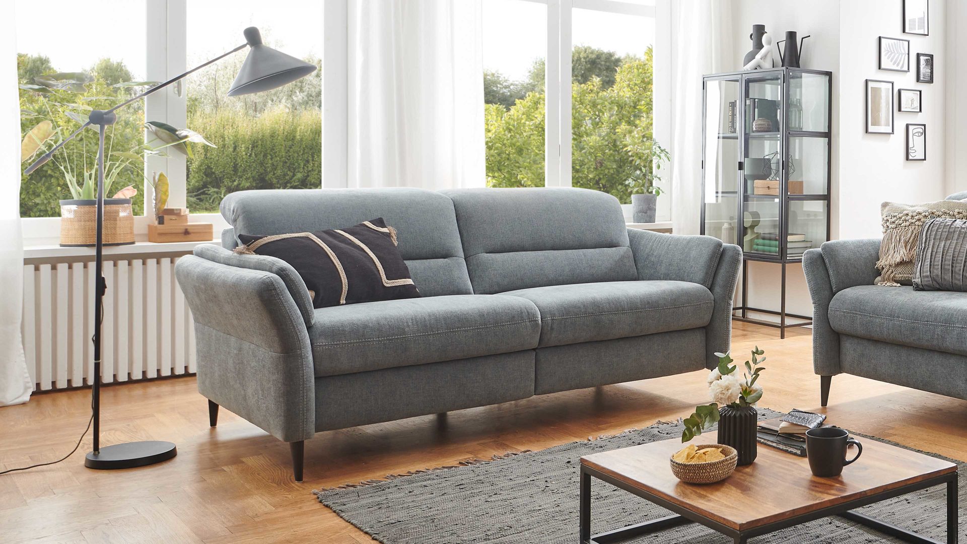 stahlfarbener Stoffbezug mit beiger Kontrast-Doppelsteppnaht