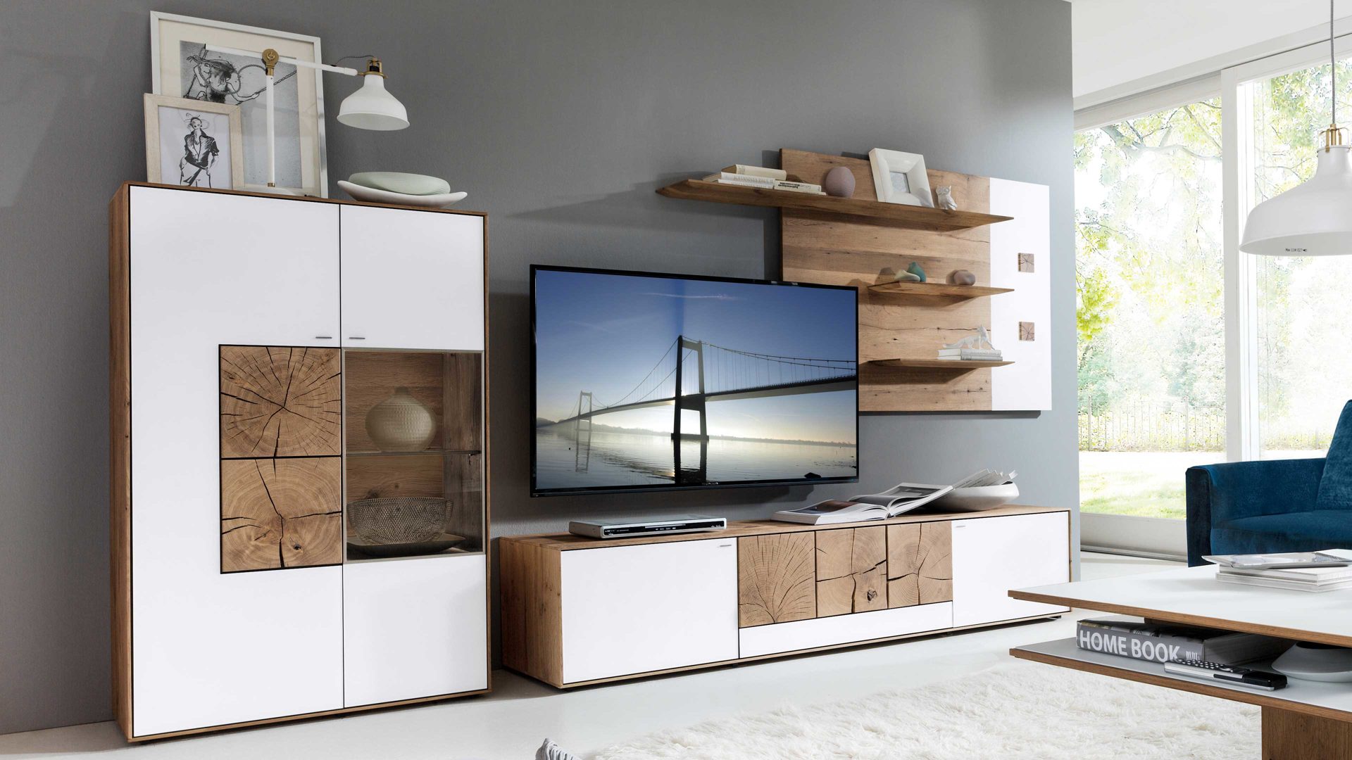 Weiße Mattglasfronten, die auf massive Kerneiche umato in Altholzoptik treffen, machen diese Wohnwand zu einem eindrucksvollen Blickfang.