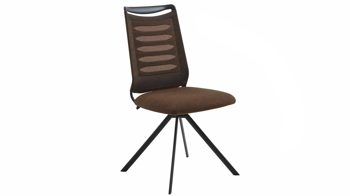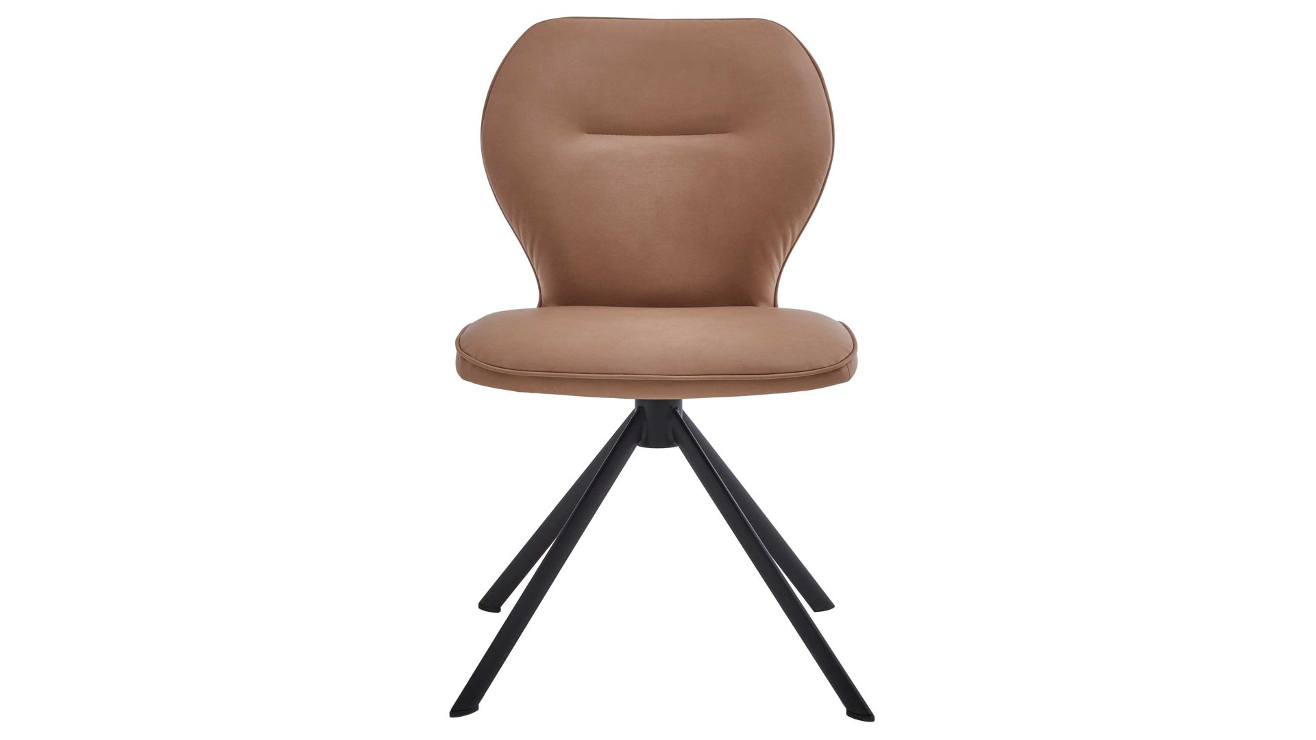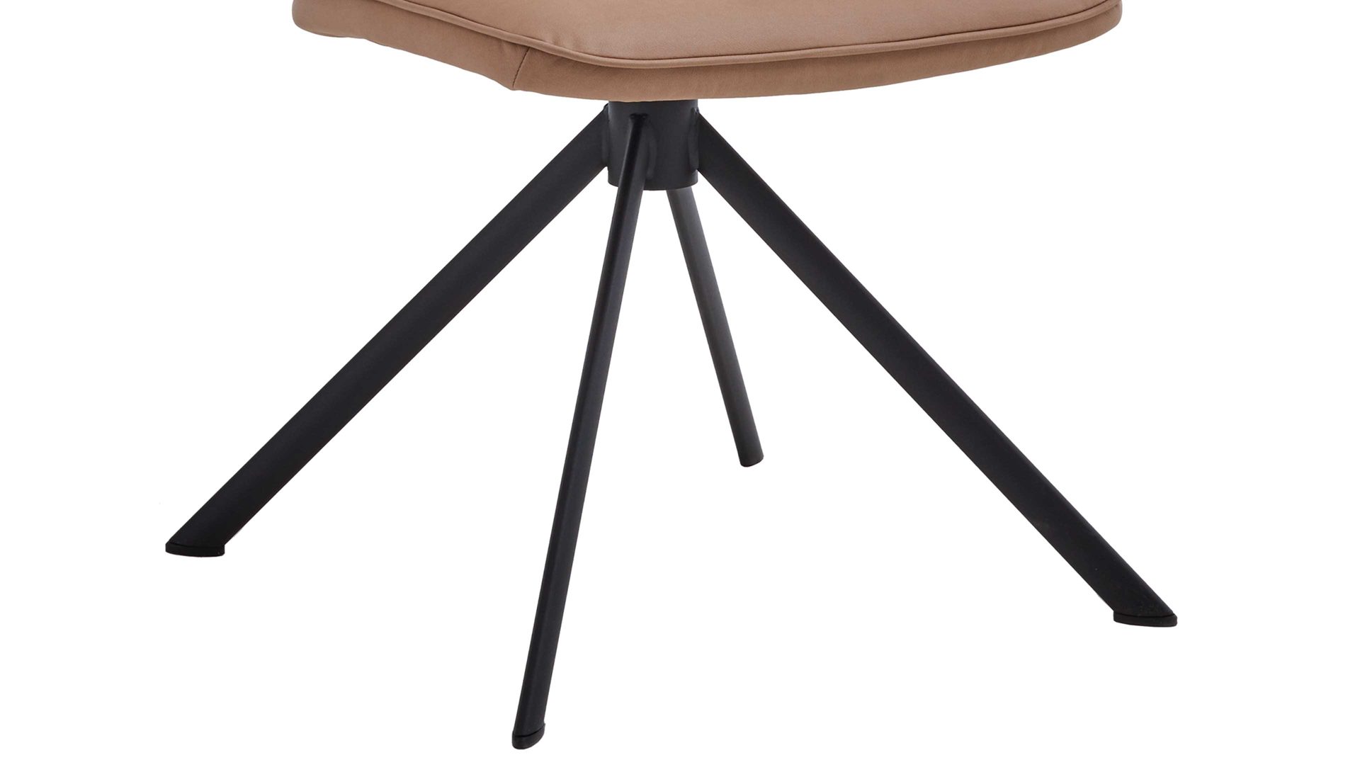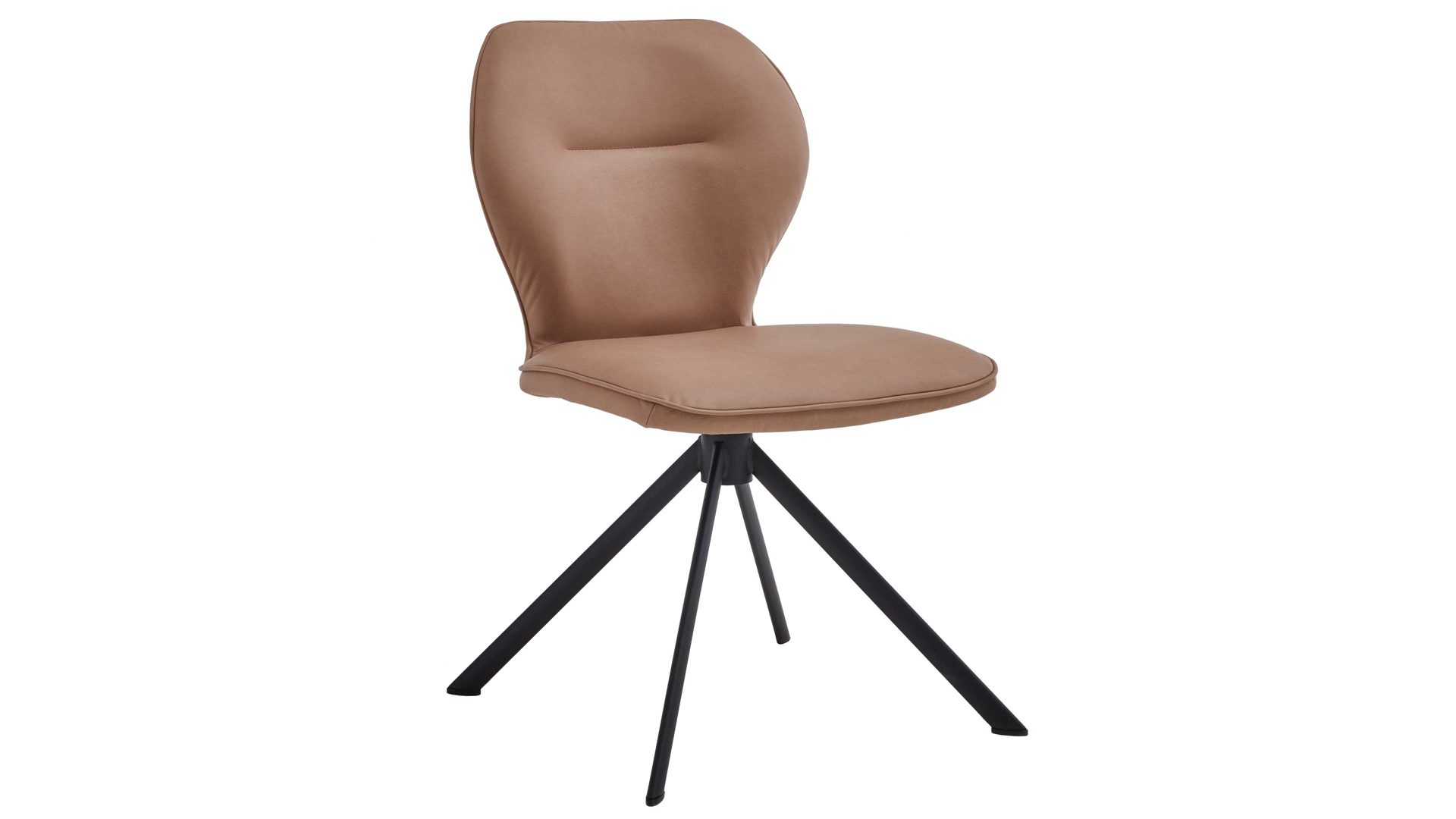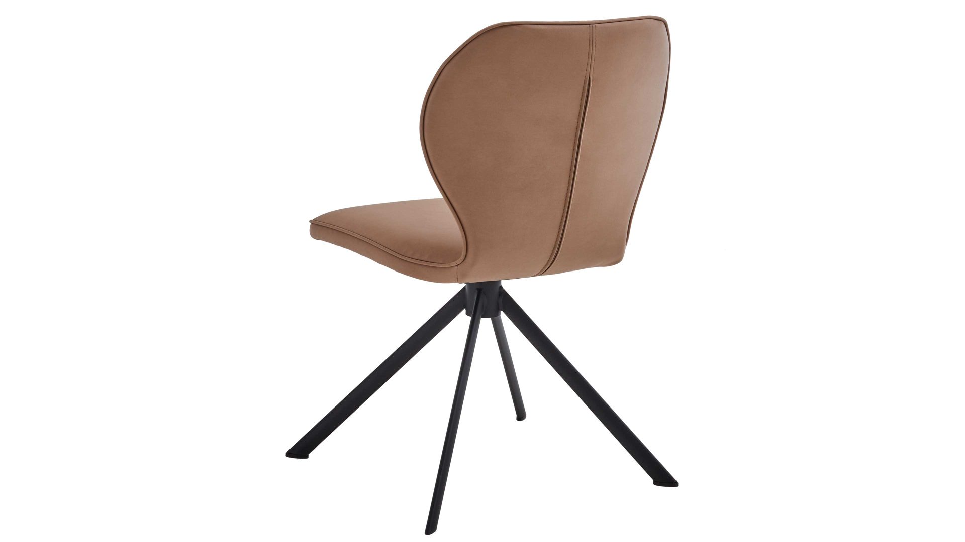 Er kombiniert ein mattschwarz lackiertes Stativgestell aus robustem Eisen mit einem taupefarbenen Mikrofaserbezug in Lederoptik und fügt sich in verschiedene Wohnstile harmonisch ein. Zu den optischen Highlights des Esszimmerstuhls gehört neben der Formensprache und den perfekt aufeinander abgestimmten Farben der markante Quereinzug im Rücken. Praktisch begeistern die Drehbarkeit um 180 Grad mit Rückholfunktion sowie die bodenschonenden Gleiter am Gestell.