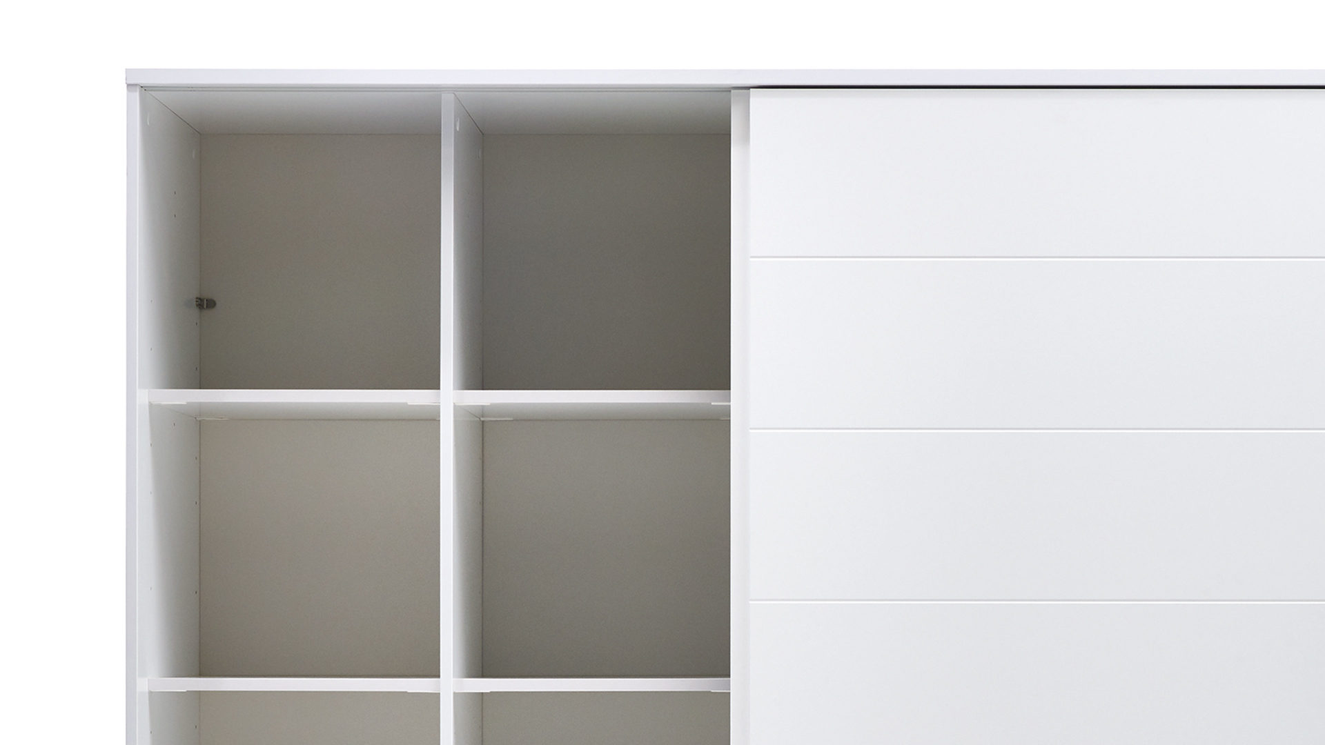 mit zwei Schiebetüren, dahinter sechs schmale Einlegeböden, ein breiter Einlegeboden und zwei Kleiderstangen