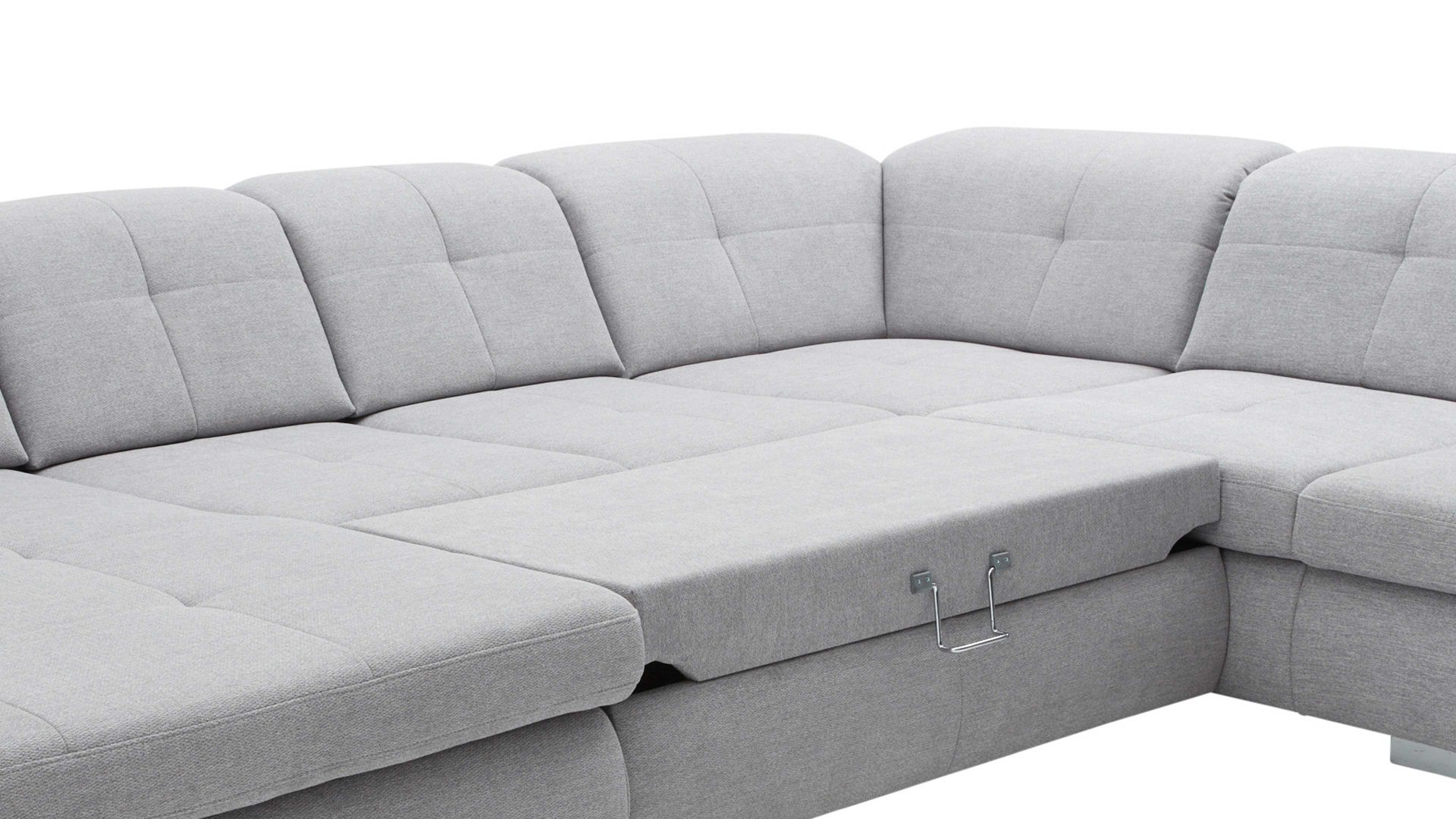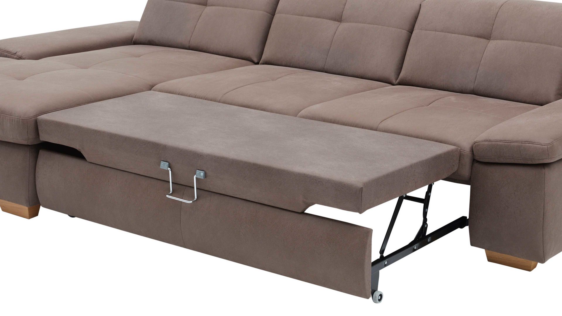 Mit der Querschläfer-Funktion verwandeln Sie die Couch schnell und einfach in ein gemütliches Gästebett oder in eine besonders große Wohnlandschaft, auf der Sie sich noch besser entfalten und entspannen können. Die Liegefläche ist mit Polyätherschaum auf Federholzleisten gepolstert sowie mit Nesselstoff bezogen, gegen Mehrpreis allerdings auch mit dem Originalstoff erhältlich.