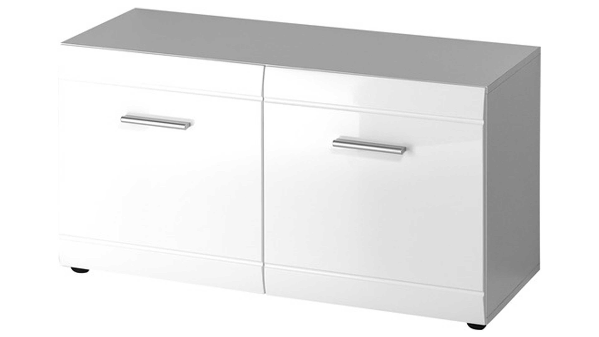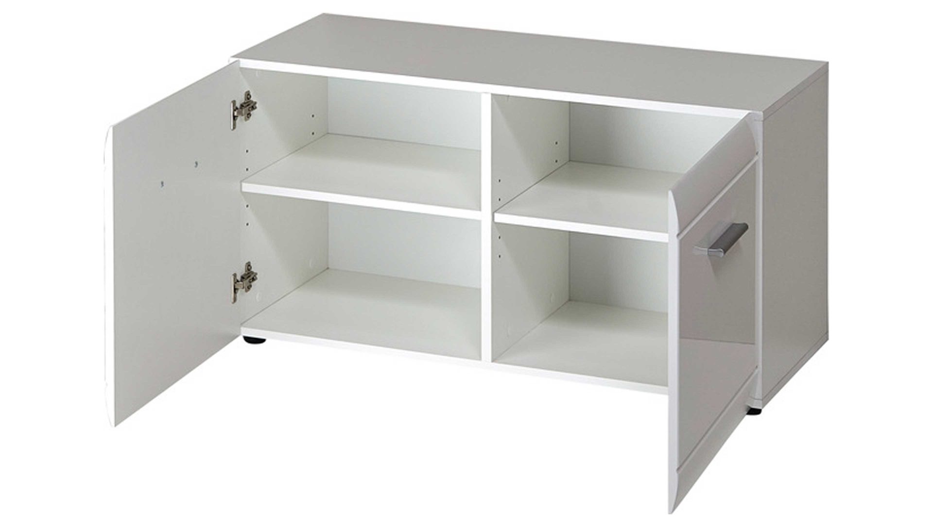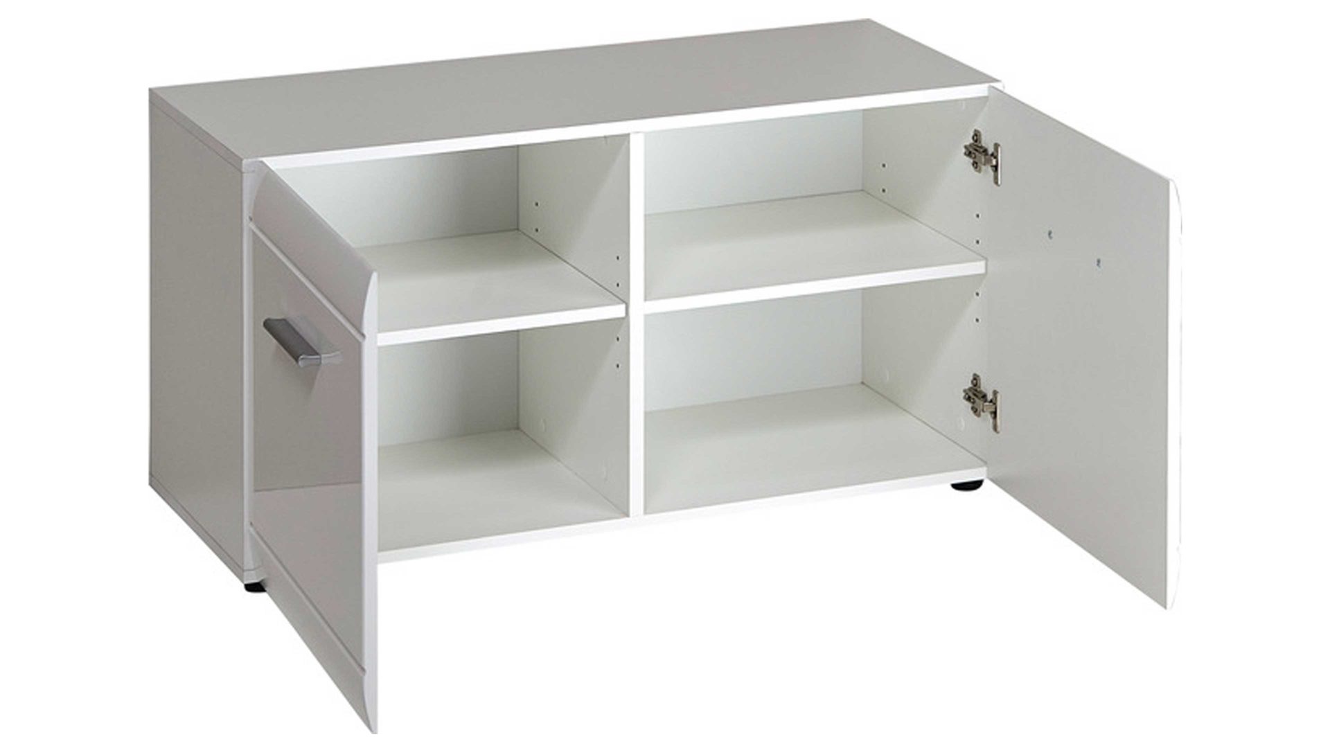 Die weiße Hochglanz-Schuhbank aus der Serie Adana überzeugt mit viel Platz für ihre Schuhe. Hinter den beiden Türen dieses Garderobenmöbels versteckt sich je ein verstellbarer Einlegeboden mit Platz für insgesamt acht Paar Schuhe. Elegante Steggriffe und die horizontale Rillenfräsung machen das Design dieser Garderobenbank aus.