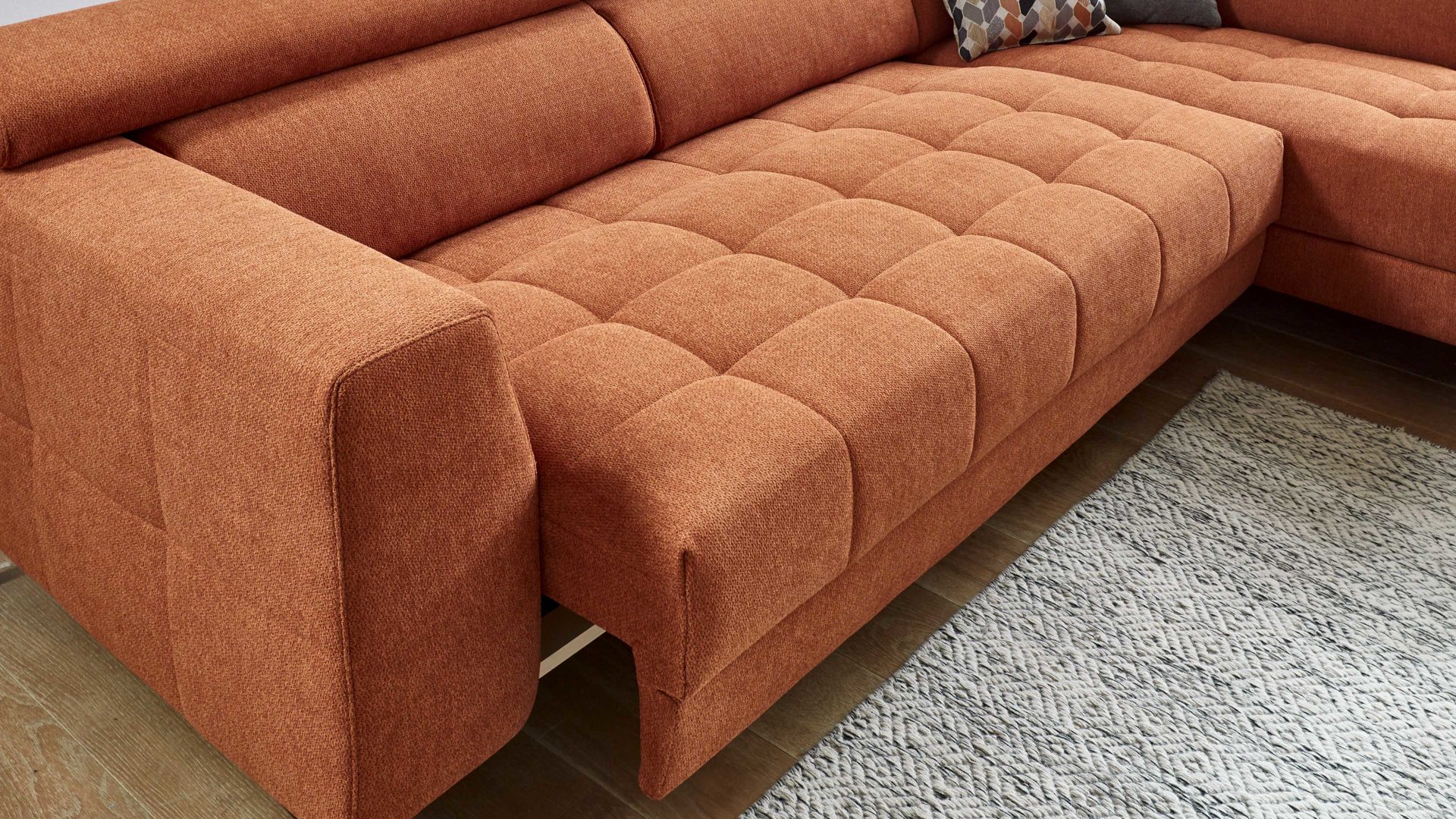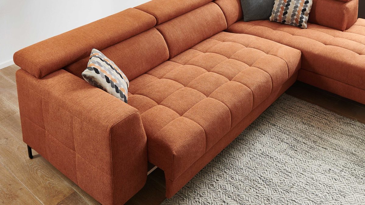 Des Weiteren können Sie zwischen zwei Fußfarben wählen und die Polsterecke ist standardmäßig mit einer Kopfteilverstellung ausgestattet.