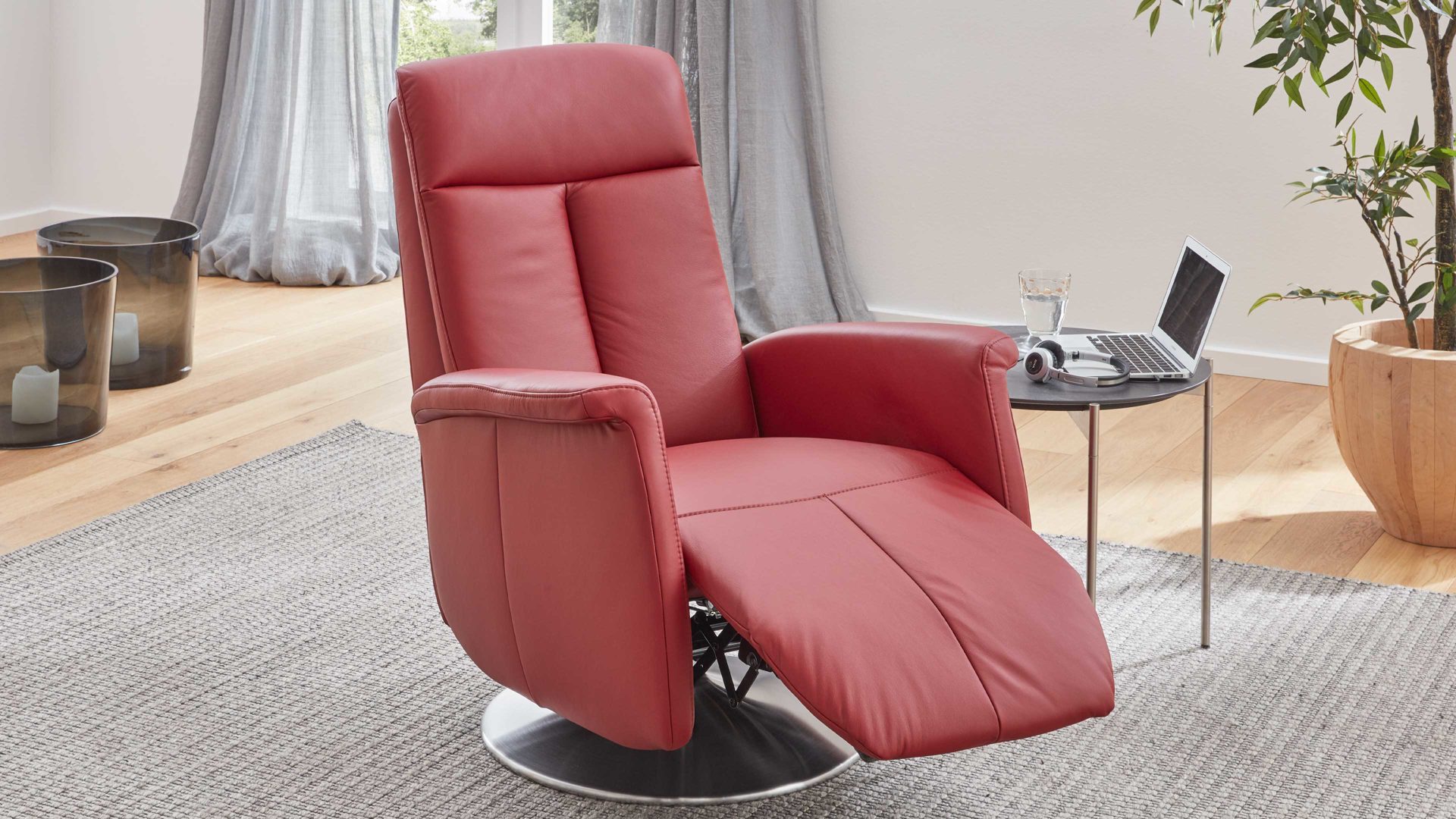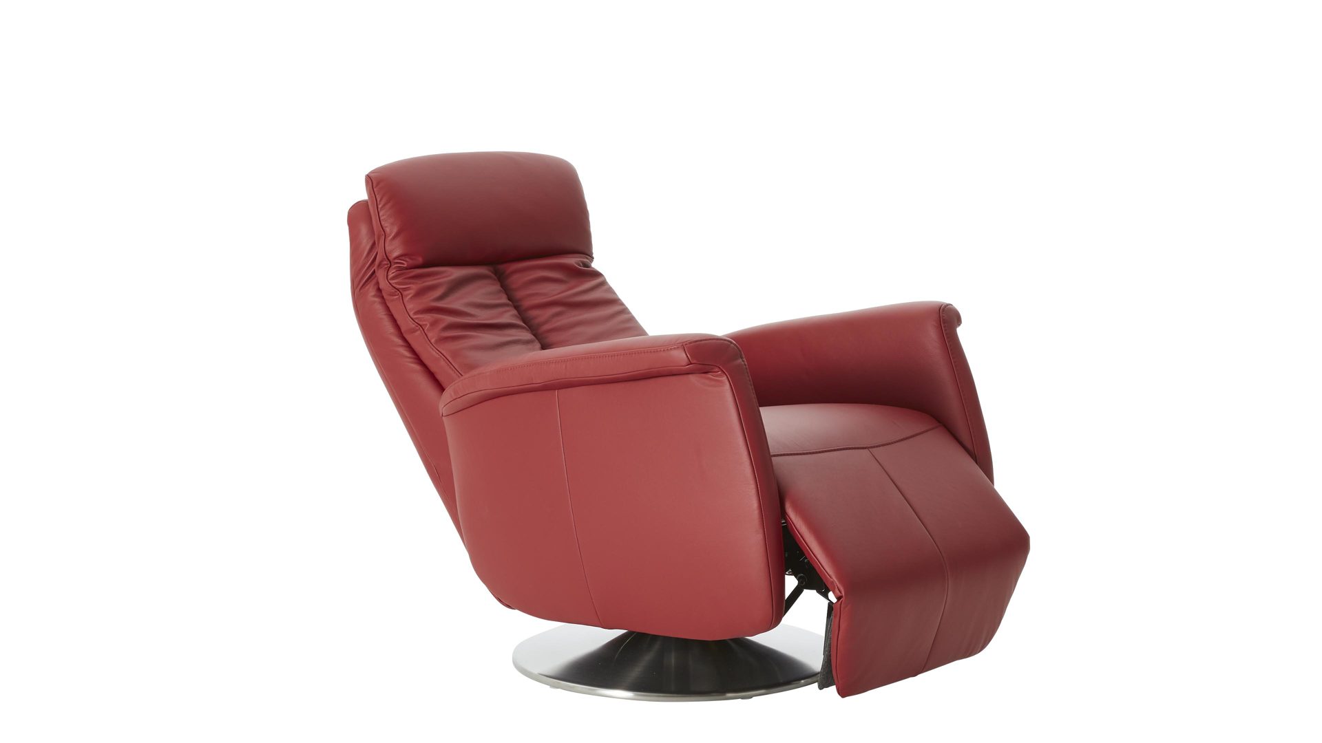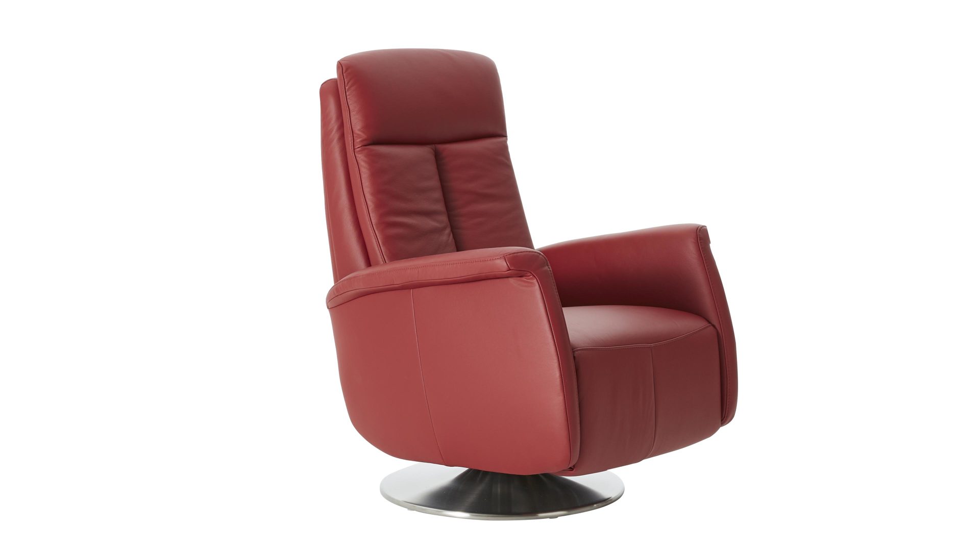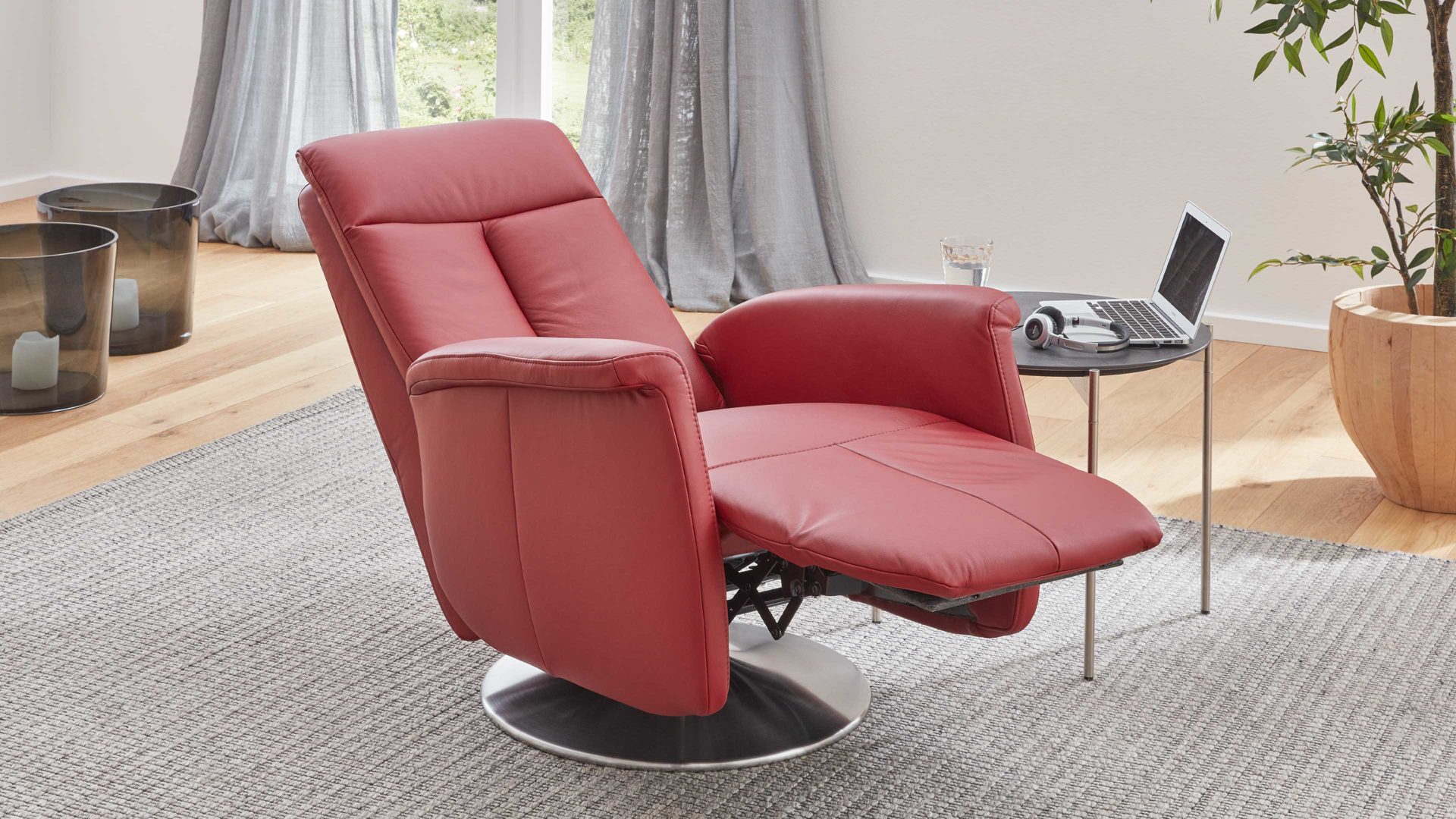 Der Modulmaster Relaxsessel MM-PN1035 kombiniert einen Edelstahl-Tellerfuß mit einem rossofarben pigmentierten Lederbezug auf der Rückenlehne D und der Armlehnvariante 2. Er strahlt intensive Eleganz aus und bringt warmes, einladendes Flair ins Wohnzimmer. Durch die erstklassigen, hervorragend verarbeiteten Materialien ist der modern designte Sessel robust und stabil, pflegeleicht und bei sorgsamer Behandlung besonders langlebig.