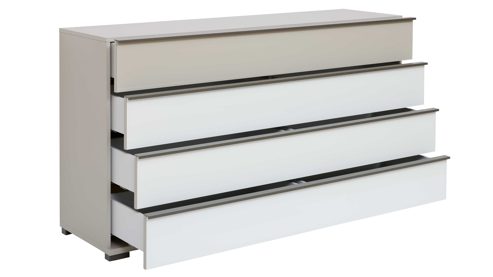 Die Schubladenkommode rundet das Set perfekt ab. Sie kombiniert drei weiße und eine kieselgraue Glasfront mit einem mattweißen Korpus und schieferfarbenen Metall-Griffleisten. Vier geräumige Schubladen mit Soft-Close und Softeinzug bieten viel Platz. Die Maße betragen ca. 149 x 82 x 42 cm (B/LxHxT).