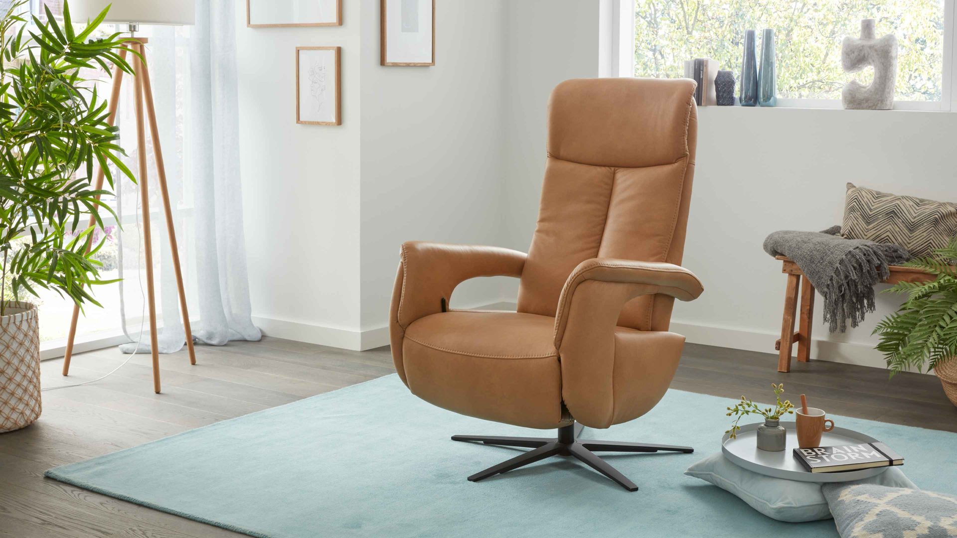 Mit dem honigfarben pigmentierten Glattlederbezug samt Ton-in-Ton-Kappnaht strahlt er moderne Eleganz aus. Für hohe Standfestigkeit sorgt der mattschwarze Aluminium-Sternfuß V1S, der die Optik zudem harmonisch abrundet.