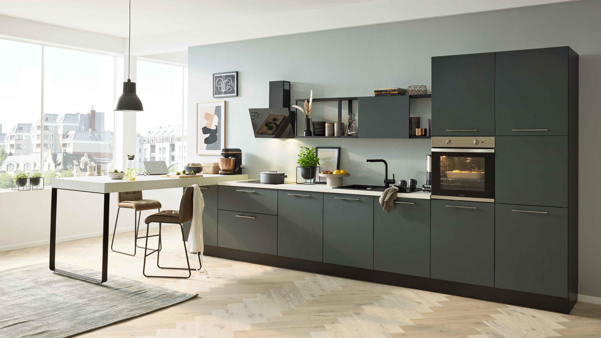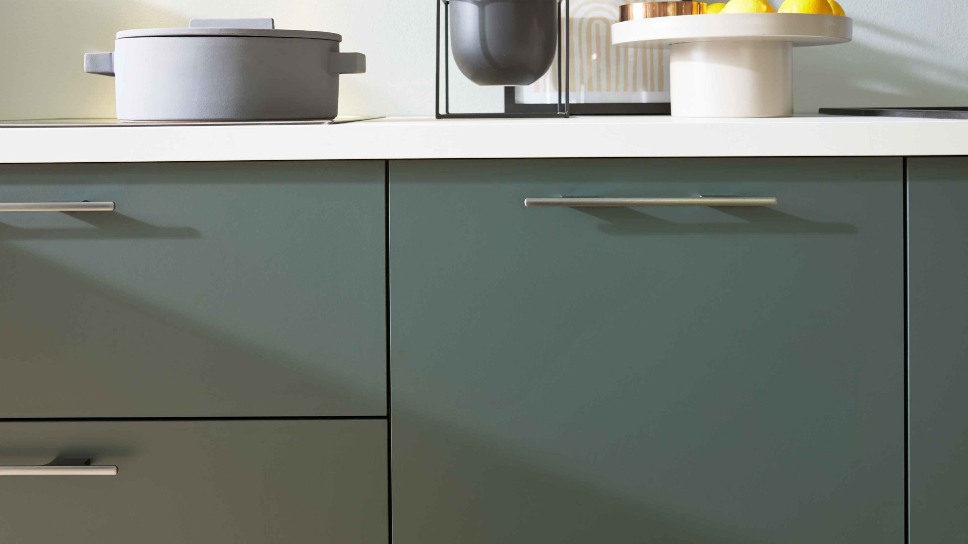 Die Interliving Küche Serie 3059 vereint matte schwarzgrüne Fronten mit einem quarzgrauen Korpus und titanfarbenen Metallgriffen. Einen besonderen Akzent setzen die Platten in weißer Marmor-Nachbildung, die der Küche eine exklusive Note verleihen. Schwarze Sockelblenden runden das modern-elegante Gesamtbild perfekt ab.