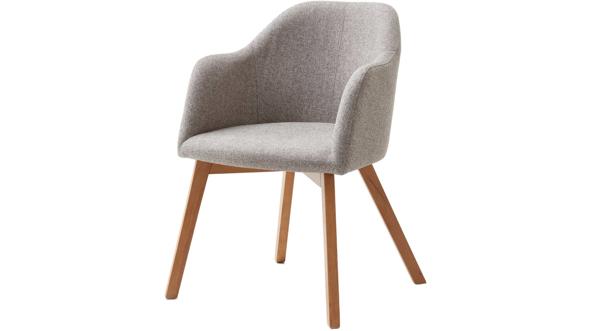 Der Armlehnstuhl Charly präsentiert sich modern und stilvoll designt. Darüber hinaus weiß er in puncto Komfort zu überzeugen. Lackierte Eichenholzfüße bilden die robuste Basis. Das natürliche Material sorgt einerseits für die nötige Stabilität und bringt andererseits ein warmes, einladendes Flair in den Raum. Attraktiv abgerundet wird der Vierfußstuhl durch den schlammfarbenen Webstoffbezug. Die trendige Farbe wirkt überaus elegant und harmoniert vorzüglich mit den Holzfüßen. Einen feinen Akzent setzt die Steppnaht im Rücken des Schalensitzes.