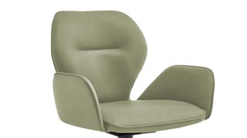 Er kombiniert ein mattschwarz lackiertes Stativgestell aus robustem Eisen mit einem lindgrünen Mikrofaserbezug in Lederoptik und fügt sich in verschiedene Wohnstile harmonisch ein. Zu den optischen Highlights des Esszimmerstuhls gehört neben der Formensprache und den perfekt aufeinander abgestimmten Farben der markante Quereinzug im Rücken. Praktisch begeistern die Drehbarkeit um 180 Grad mit Rückholfunktion sowie die bodenschonenden Gleiter am Gestell.