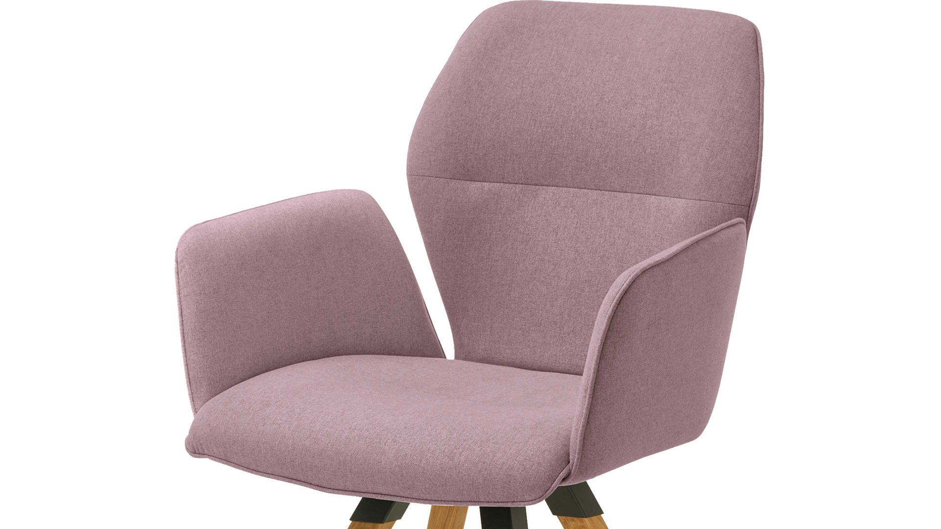 Der Armlehnstuhl Merlot präsentiert sich modern, kreativ und stilvoll designt. Er kombiniert einen auberginefarbenen Webstoffbezug mit einem Stativ-Gestell aus massivem Wildeichenholz und schwarzen Akzenten. Das Echtholz sorgt für eine stabile Basis sowie für natürliches und warmes Flair im Esszimmer. Dazu trägt auch der charmante Farbton des hochwertigen, angenehm weichen Stoffbezugs bei. Überdies unterstreicht die spezielle Formensprache des Gestells die originelle Ausstrahlung des Vierfußstuhls.