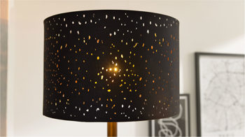 Die moderne Stehleuchte aus der Interliving Leuchten Serie 9343 umfasst einen großen und einen kleinen schwarzen Textillampenschirm mit Dekorstanzung für einen romantischen Sterneneffekt.